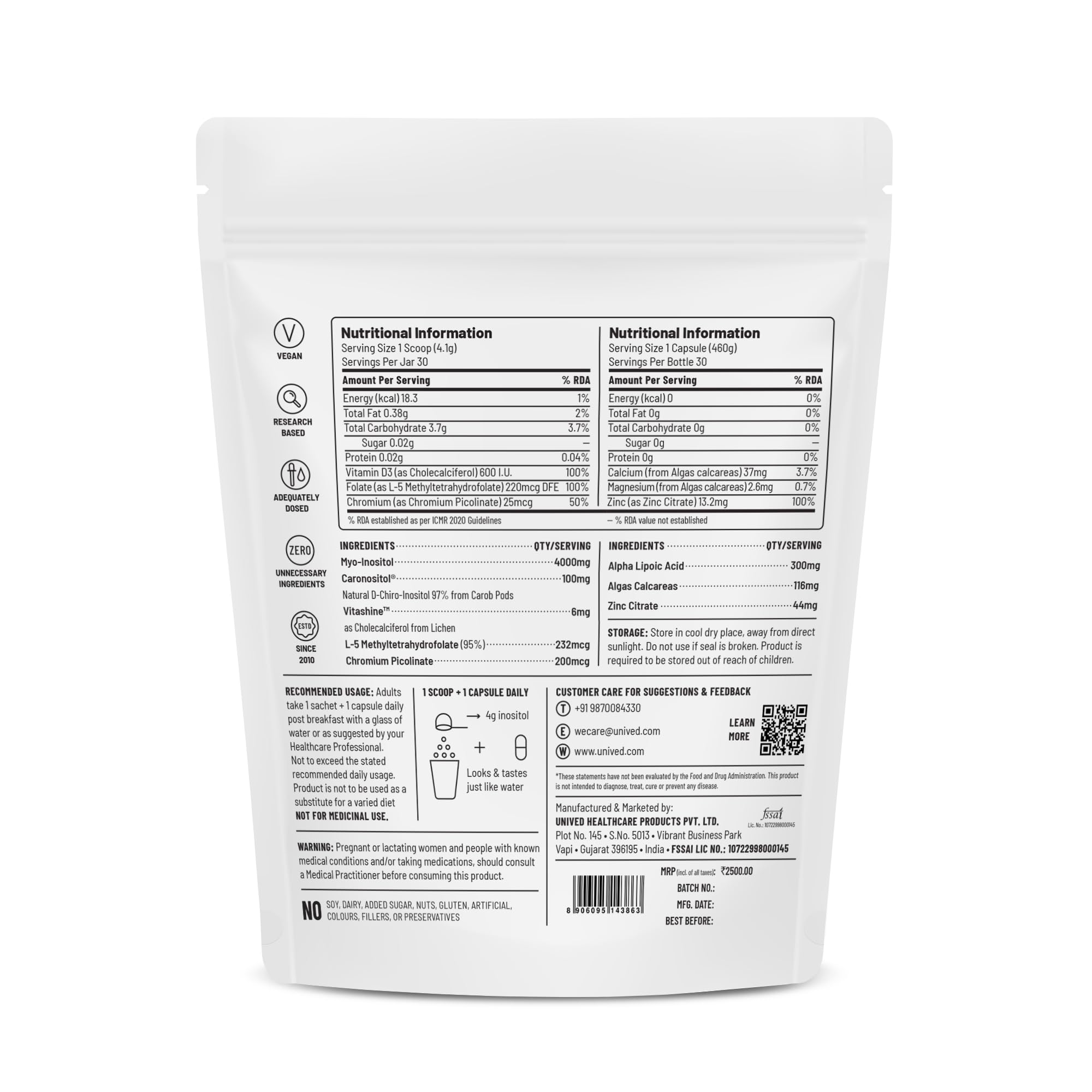 Unived PCOS Supplement with 4000mg Myoinositol and 100mg D-Chiro-Inositol as Caronositol for severe PCOS. We offer the optimal 40:1 inositol ratio.