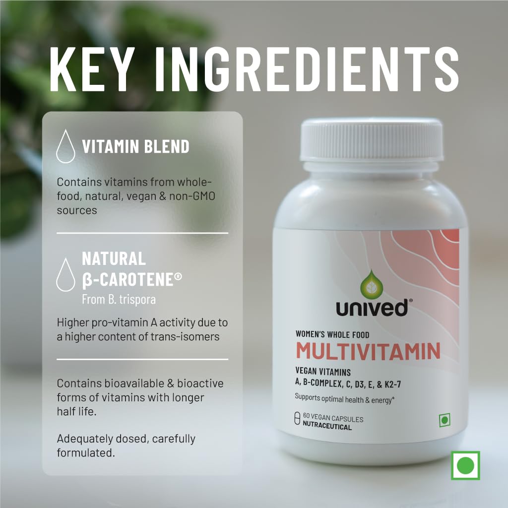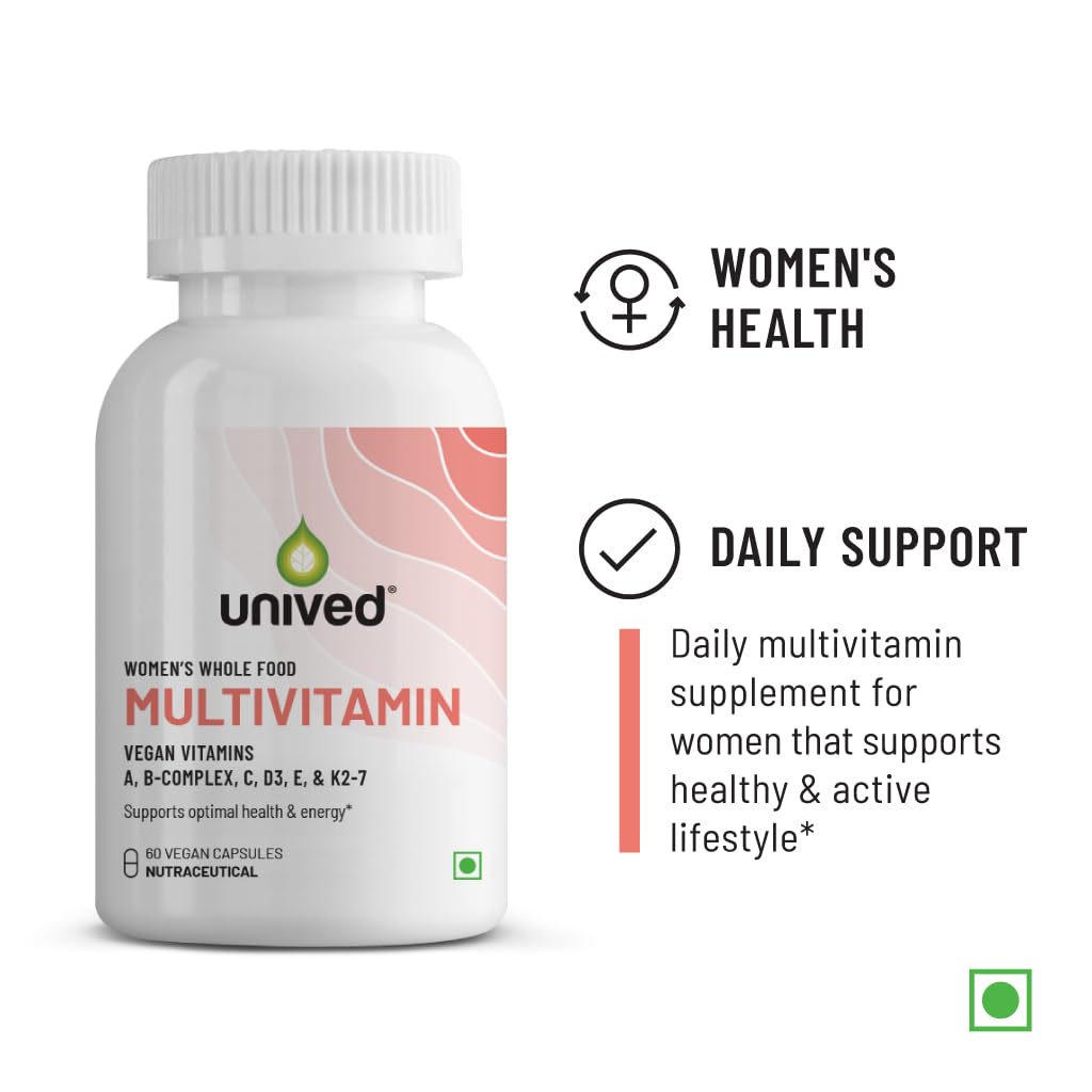 Unived Wholefood Multivitamin for Women | Vegan Plant-Based Multivitamins A B-Complex C D3 E & K2-7| Natural Wholefood Plant Based & Vegan | 60 Capsules