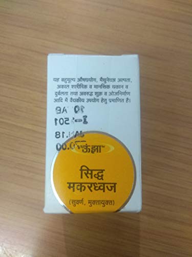 Unjha Siddha Makardhwaja (With Gold & Pearl) pack of 10 tabs 0 Siddha Makardhwaj (Swarna Moti Yukta) is an ayurvedic mineral-based preparation used for its aphrodisiac characteristics It beefs up the body and it is beneficial in almost all types of diseses. It also enhances the effectiveness of other mediciines It is seldom recommended alone. In different diseses it is given along with different adjuvants