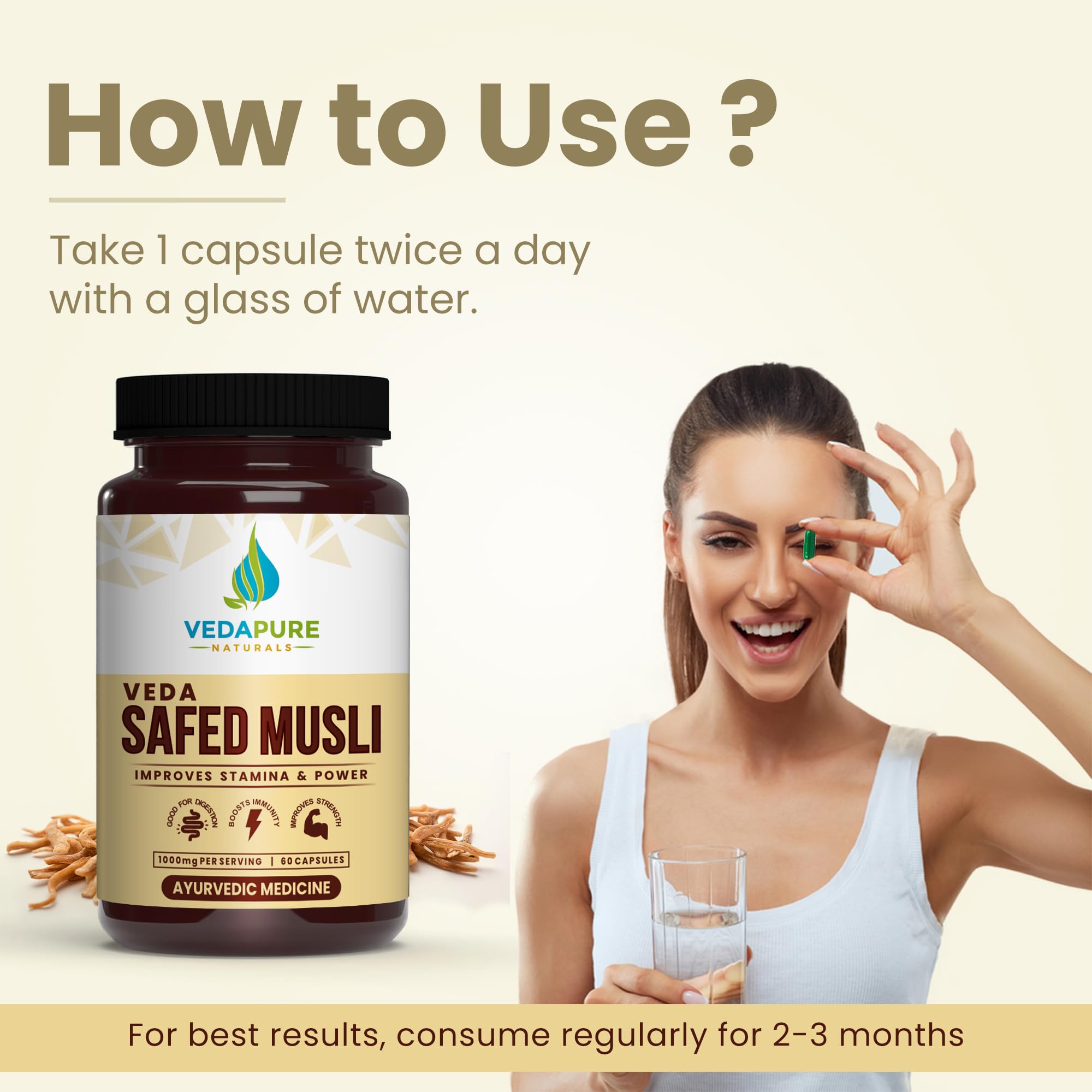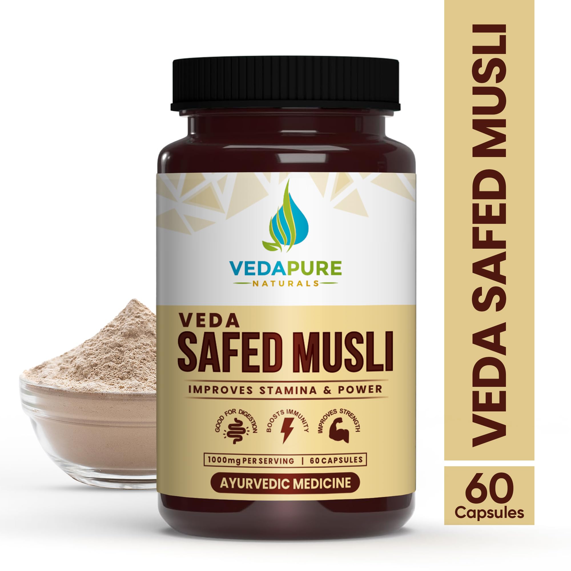 VEDAPURE Natural Safed Musli Capsules (1000mg) - 60 Capsules Veda Safed Musli Extract for Immunity Strength Energy Level Enhances Body Performance and Healthy Bones for Men & Women