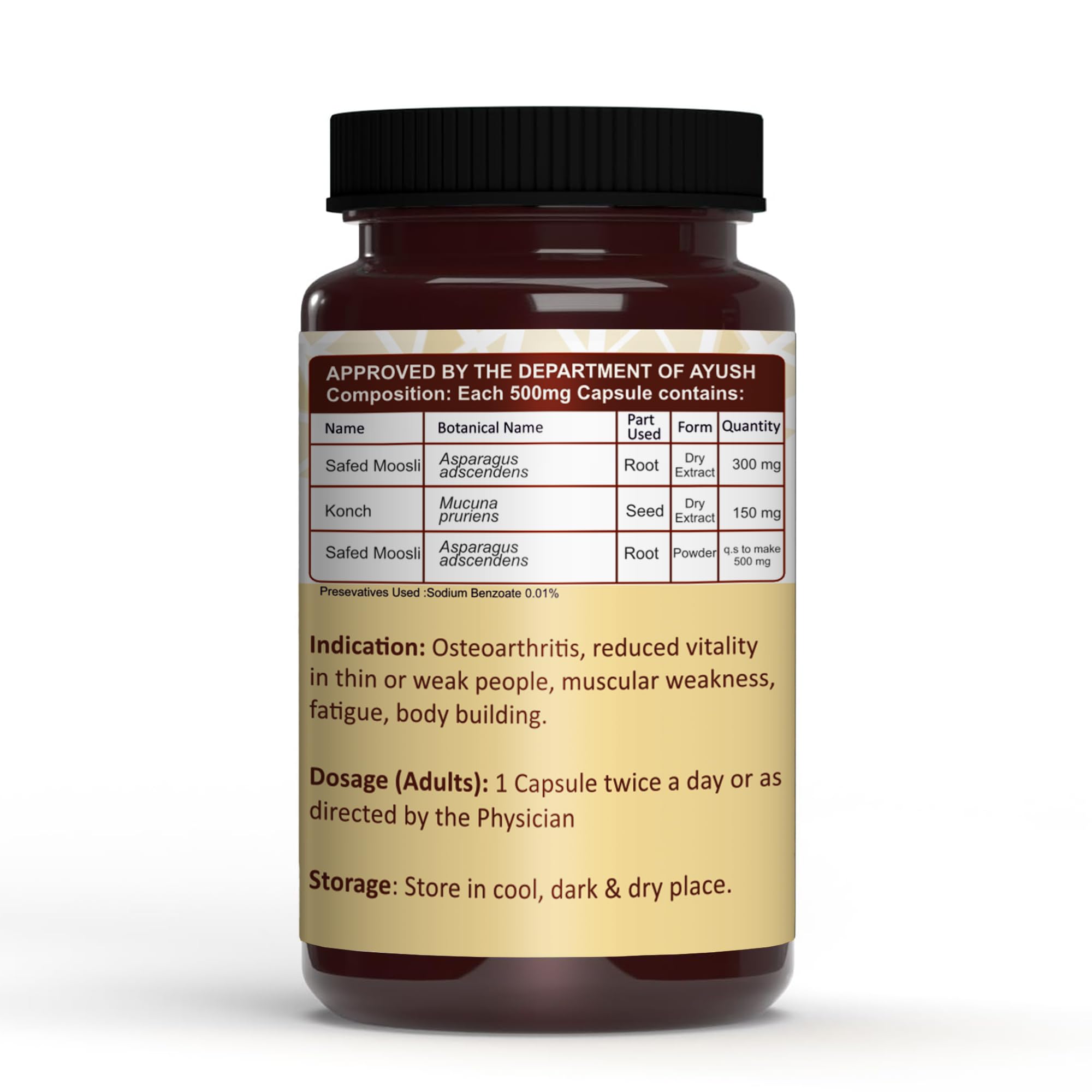• Pure Extract: Each capsule typically contains 1000mg of pure Safed Musli extract ensuring potency and efficacy. This formulation aims to deliver the herb's beneficial properties effectively for holistic health support