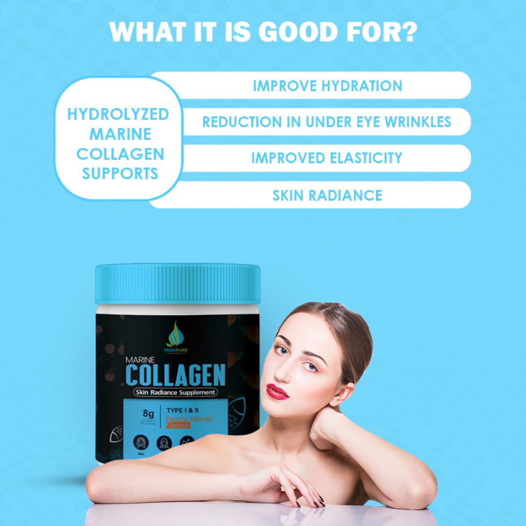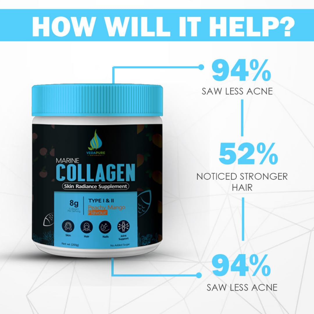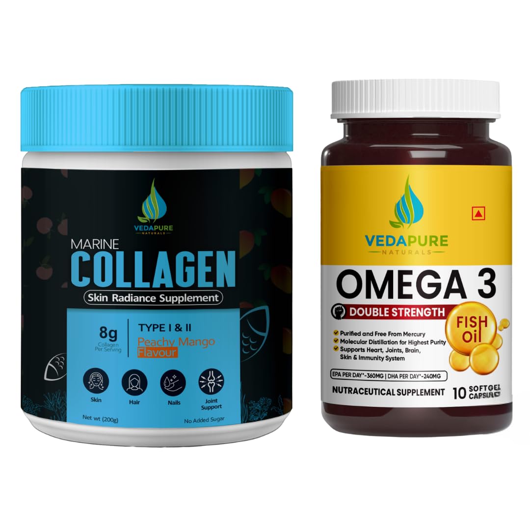 Vedapure Naturals Marine Collagen Powder & Omega 3 Fish Oil Capsule Combo is a complete health supplement designed for both men and women. It supports heart brain joint muscle and skin health with the combined power of marine collagen and Omega-3 fatty acids. Ideal for daily use it promotes overall wellness youthful skin and active living.