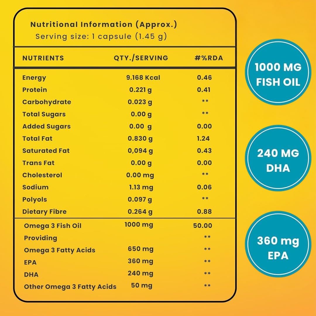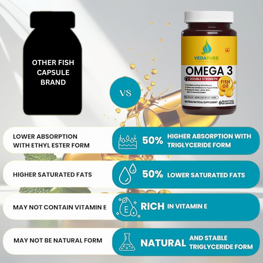 Vedapure Omega 3 Fish Oil Capsules | Omega 3 Supplement Triple Strength 1000mg | 60 Fish Oil Sofgelsfor Men and Women | With 360 EPA & 240 DHA | Improves Heart Brain & Joint Health (Pack of 1)