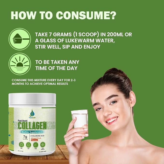 VEDAPURE Plant Based Skin Collagen Builder Supplement | Mixed Fruit, Skin Collagen Booster for Men & Women with Hyaluronic Acid, Biotion, Vitamin E & C, Healthy Skin, Joints, Hairs, Nails 210 Gram