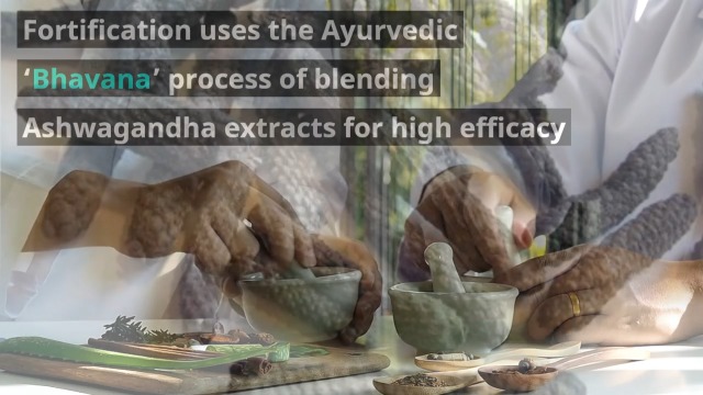 • Fortification' is done by the Ayurvedic ‘Bhavana' process of blending them with Ashwagandha extracts to enhance efficacy. Also it is Potentiated with Pippali extract containing Piperine to improve absorption for quick results.
