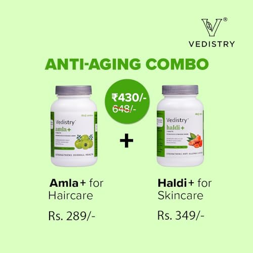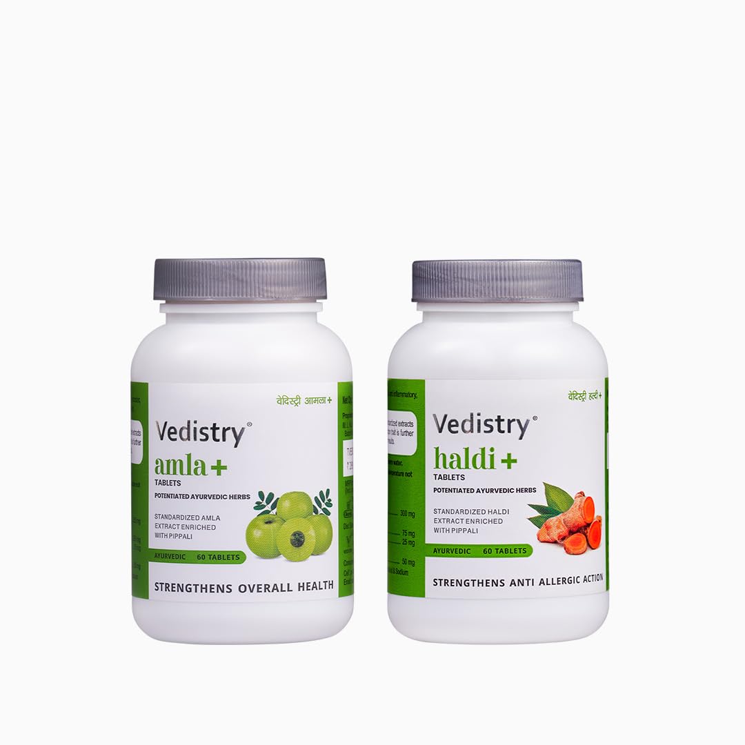 Amla for Haircare & Haldi for Skincare Vedistry presents a wonderful combination of Amla + tablets & Haldi + tablets (Enriched with Piperine for absorption) to promote skin & hair health. Amla is known for its ability to improve hair health · Nourishes hair from the roots · Supports healthy hair growth Haldi is particularly beneficial for skin health · Offers radiant skin glow · Brightens & even out skin tone Vedistry's Amla+ is an Ayurvedic rejuvenator to promote hair growth and prevents hair fall and greying. It improves hair health and nourishes hair roots. Vedistry Haldi+ is an immuno-modulator that improves skin health and fights skin allergies. With antioxidant properties Haldi+ improves skin complexion & glow.