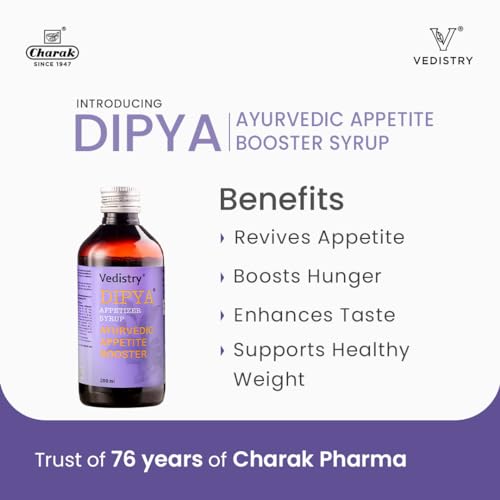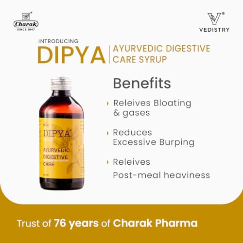 Vedistry Dipya Combo Kit contains Digestive care syrup Appetiser syrup Gut cleanser Acidity Relief Tablets for all your Digestion related problems. It has trust of Charak's 76 year old Ayurvedic Expertise and 100% Ayurvedic. Dipya Ayurvedic Digestive Care Syrup is a digestive health supplement with 19 powerful ayurvedic digestive herbs to help improve and strengthen digestion. It provides relief from gas bloating and post-meal heaviness. It improves digestion by stimulating enzymes and relieves bloating and stomach discomfort. It reduces acidity and acid reflux.