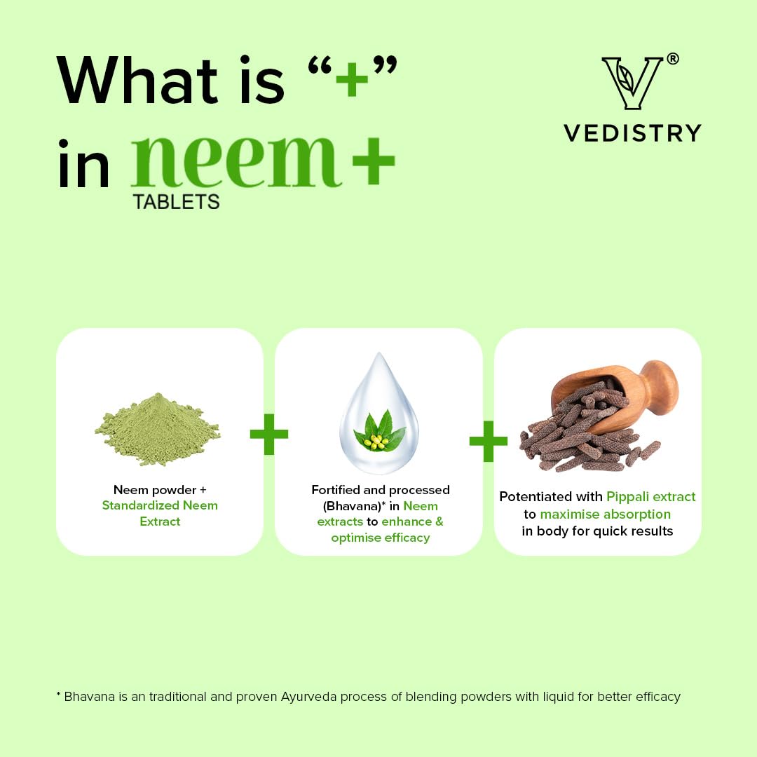 Vedistry Neem + is made with Standardized 250 mg of Neem Extracts and 250 mg of Pure Neem powder. âFortification is done by the Ayurvedic âBhavana process of blending them with 50 mg of Neem extracts to enhance efficacy.