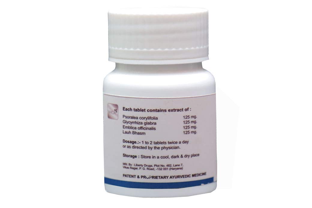 Ingredients:Each 500 milligram (mg) Tab. contains extract of: Common Name (Latin Name) Quantity (in mg) Bavachi (Psoralea corylifolia) 125 Yasthimadhu (Glycyrrhiza glabra) 125 Amla (Emblica officinalis) 125 Lauha Bhasm 125