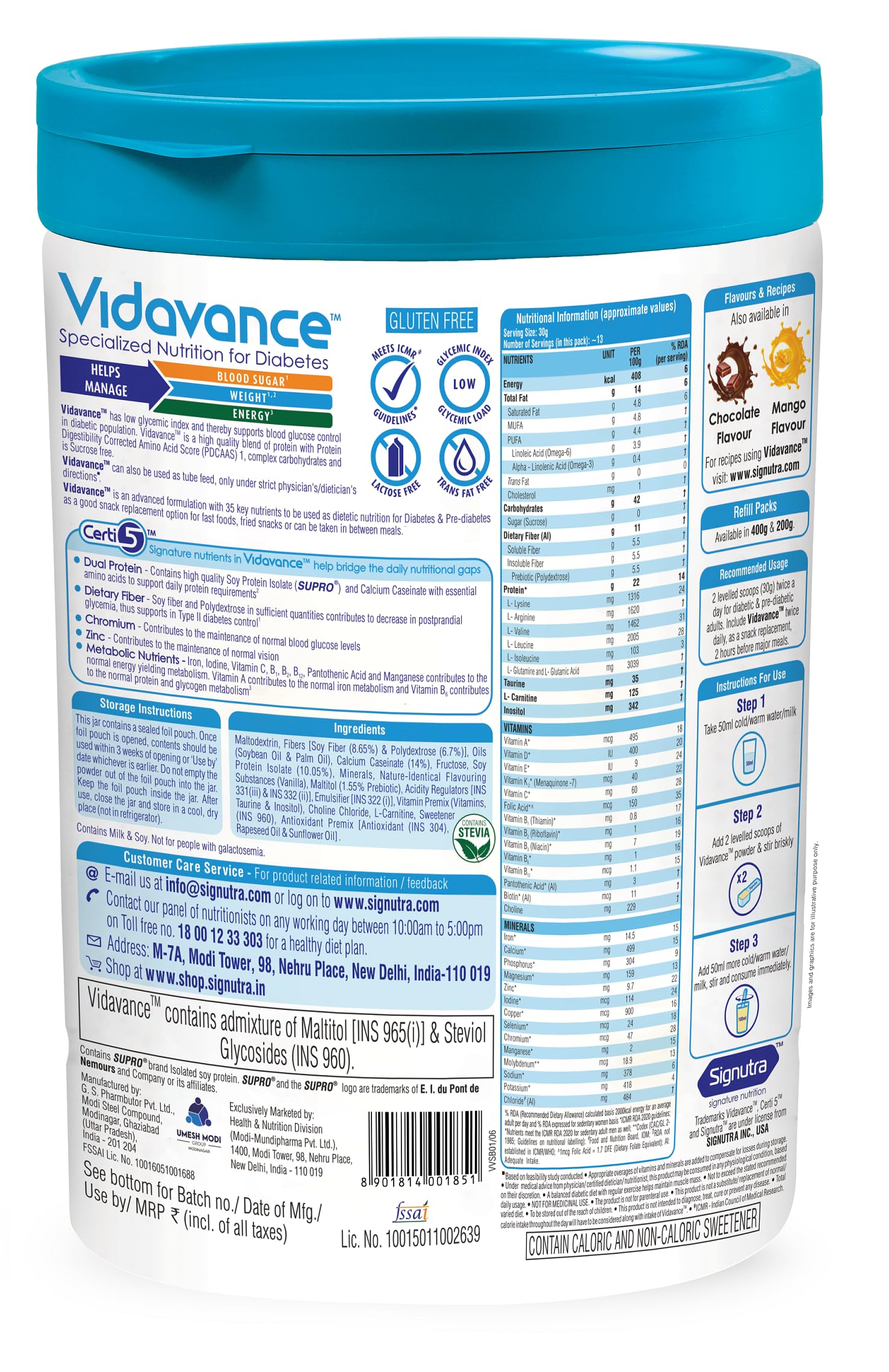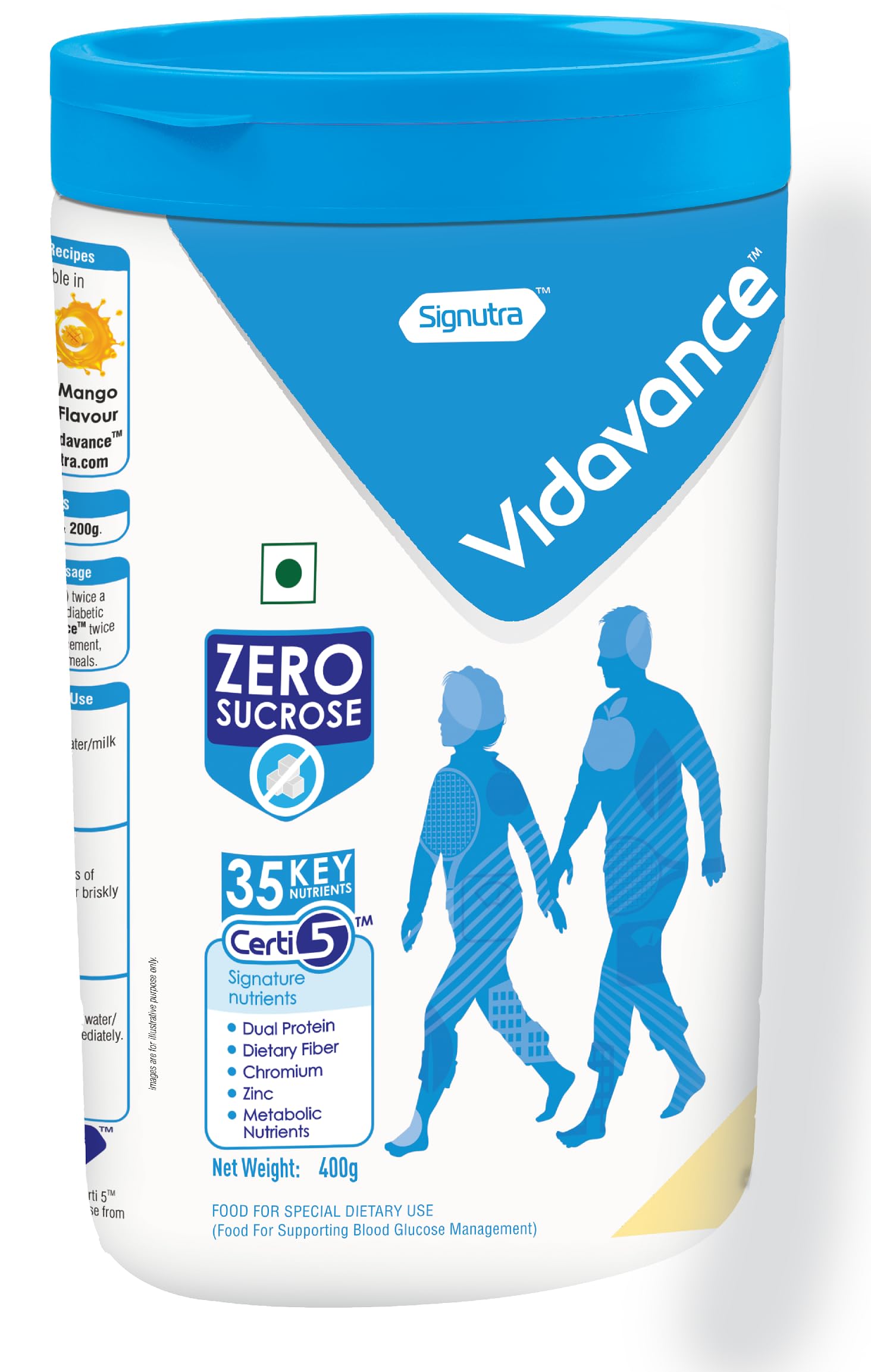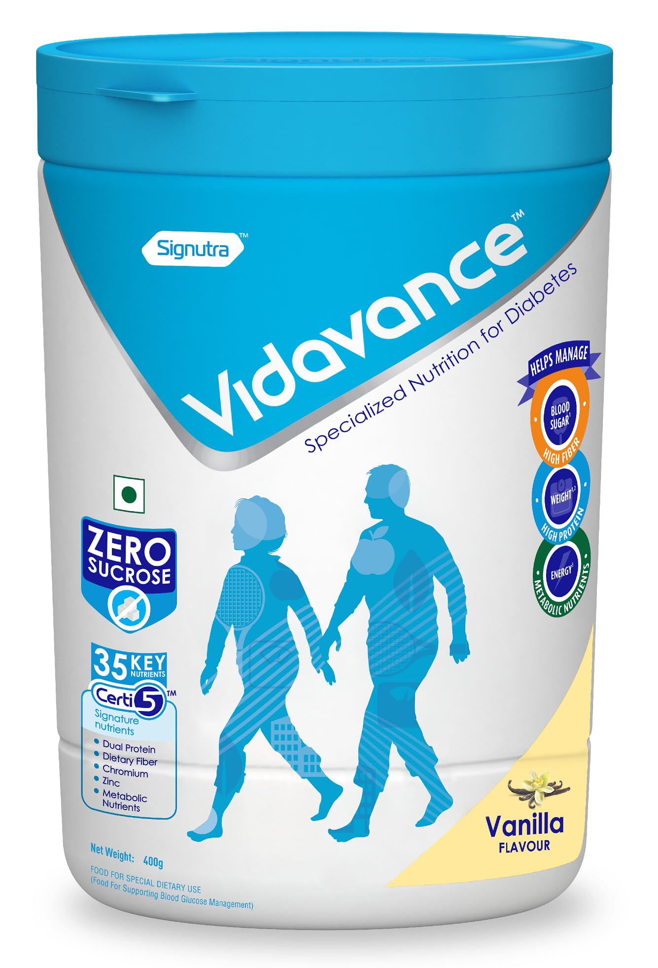 VidavanceTM is an advanced formulation with 35 key nutrients to be used as dietetic nutrition for Diabetes & Prediabetes as a good snack replacement option for fast foods fried snacks or can be taken in between meals. VidavanceTM has low glycemic index and thereby supports blood glucose control in diabetic population. VidavanceTM is a high quality blend of protein with Protein Digestibility Corrected Amino Acid Score (PDCAAS) 1 complex carbohydrates and is Sucrose Free.