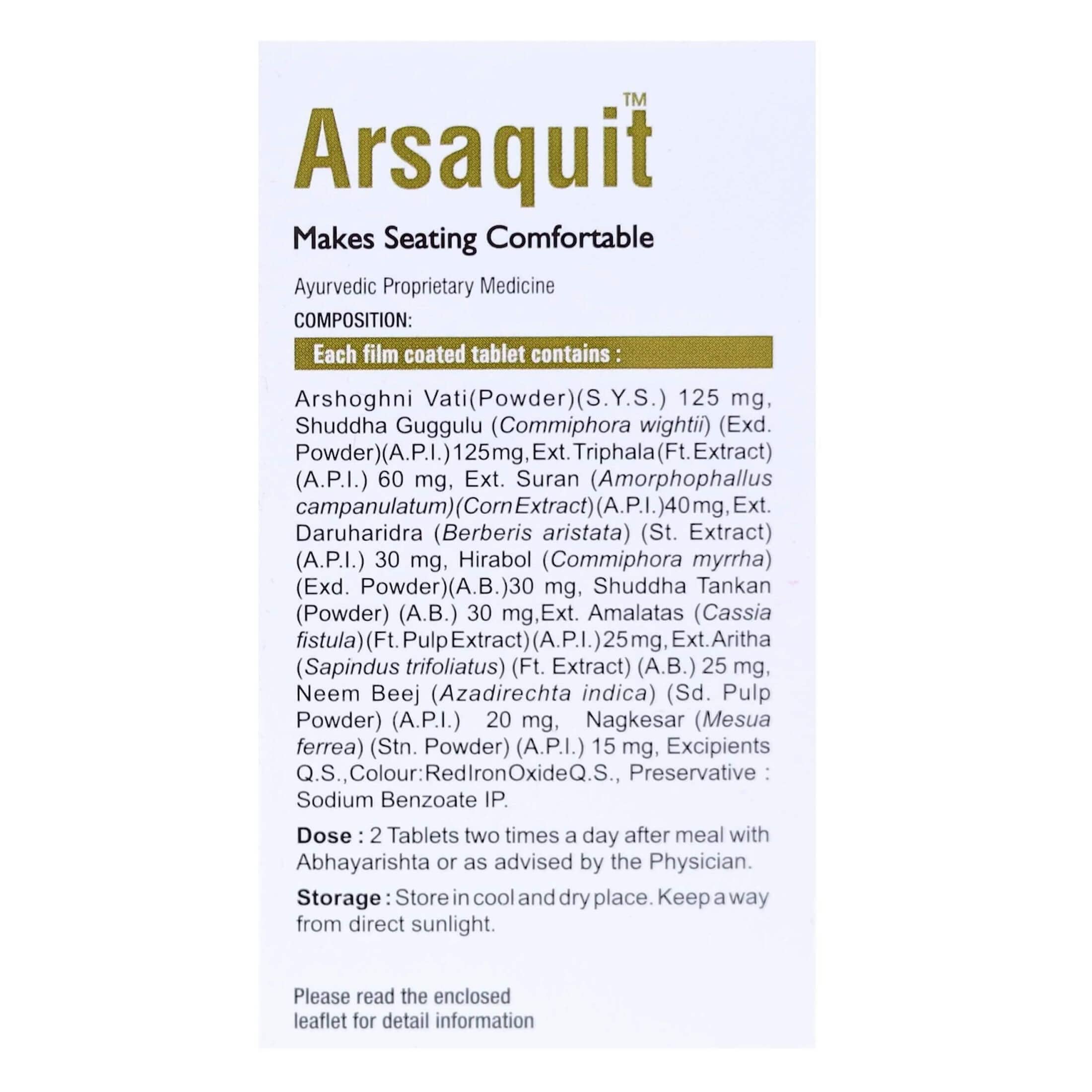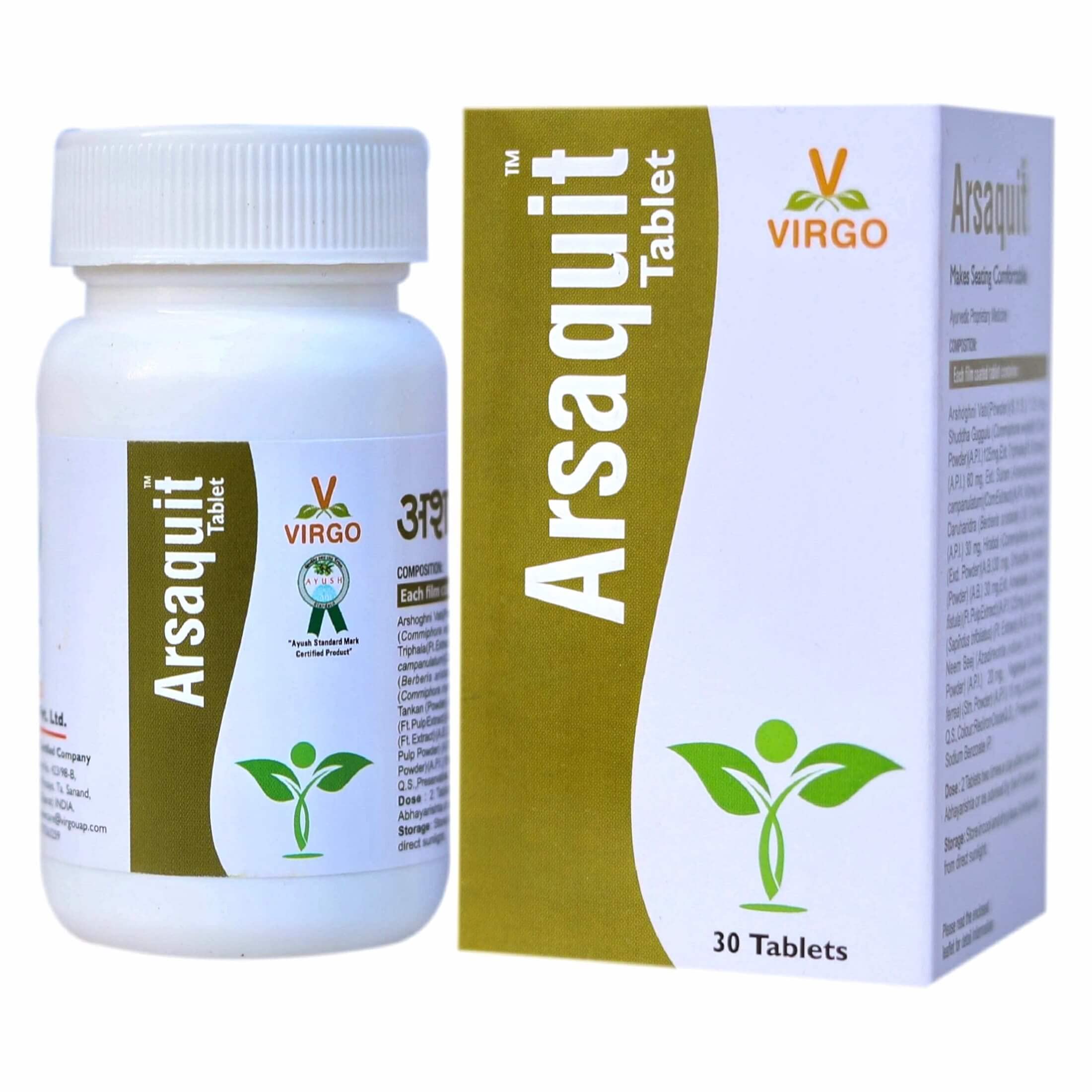 Virgo Arsaquit Tablets are a herbal supplement formulated with a blend of natural ingredients known for their beneficial properties in supporting digestive health and providing relief from hemorrhoids (piles). Each tablet contains a combination of Shuddha Guggulu Triphala Suran Daruharidra and Shuddha Tankan carefully selected for their therapeutic effects on the digestive system. These tablets are designed to alleviate symptoms associated with hemorrhoids such as pain itching inflammation and bleeding while also promoting overall gastrointestinal wellness. Tablets offer a natural and herbal solution for supporting digestive health and providing relief from hemorrhoids. With a unique blend of traditional Ayurvedic ingredients these tablets are designed to alleviate symptoms associated with hemorrhoids while promoting overall gastrointestinal wellness. Each tablet is formulated with care to ensure safety efficacy and convenience for users seeking natural remedies for digestive discomfort.
