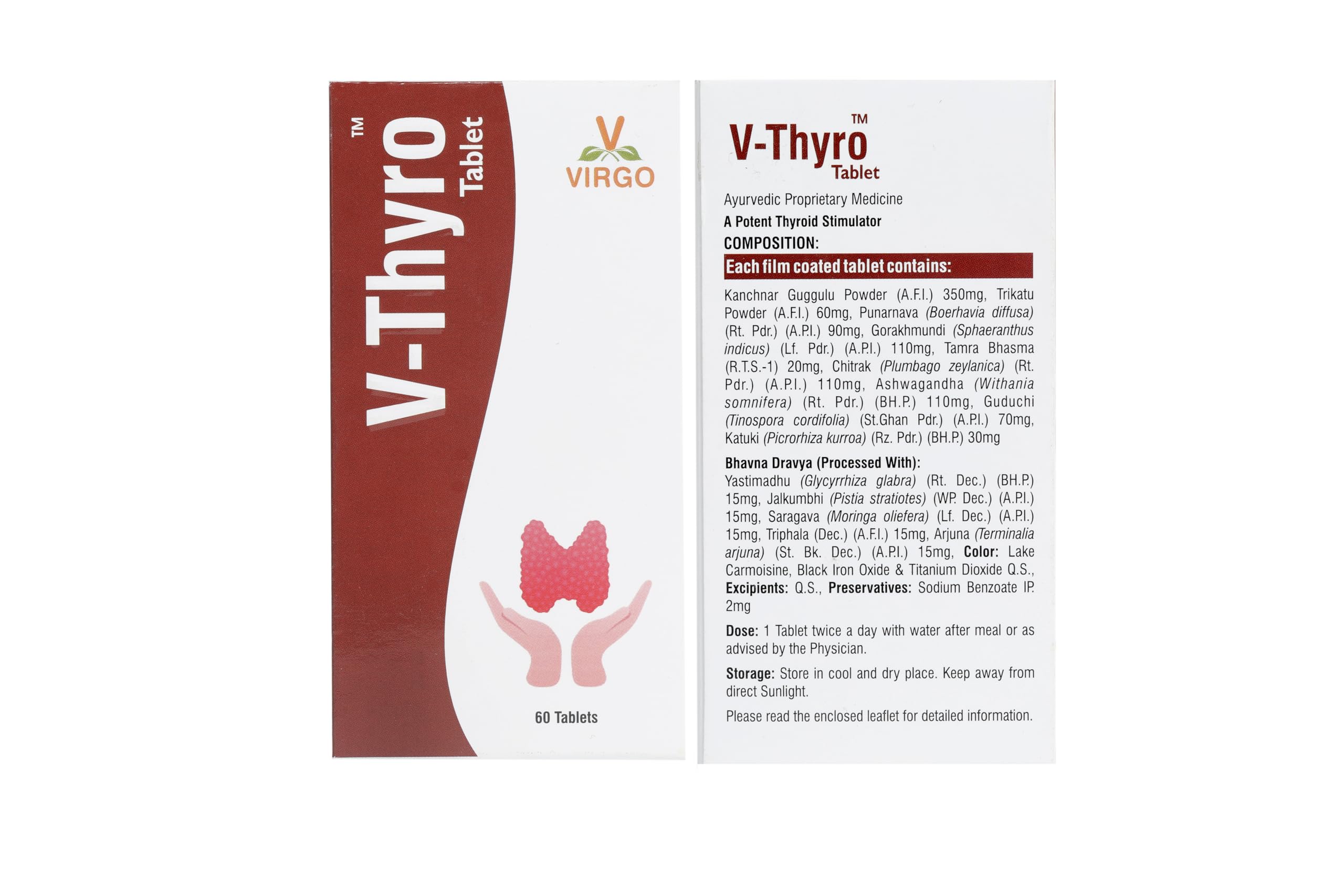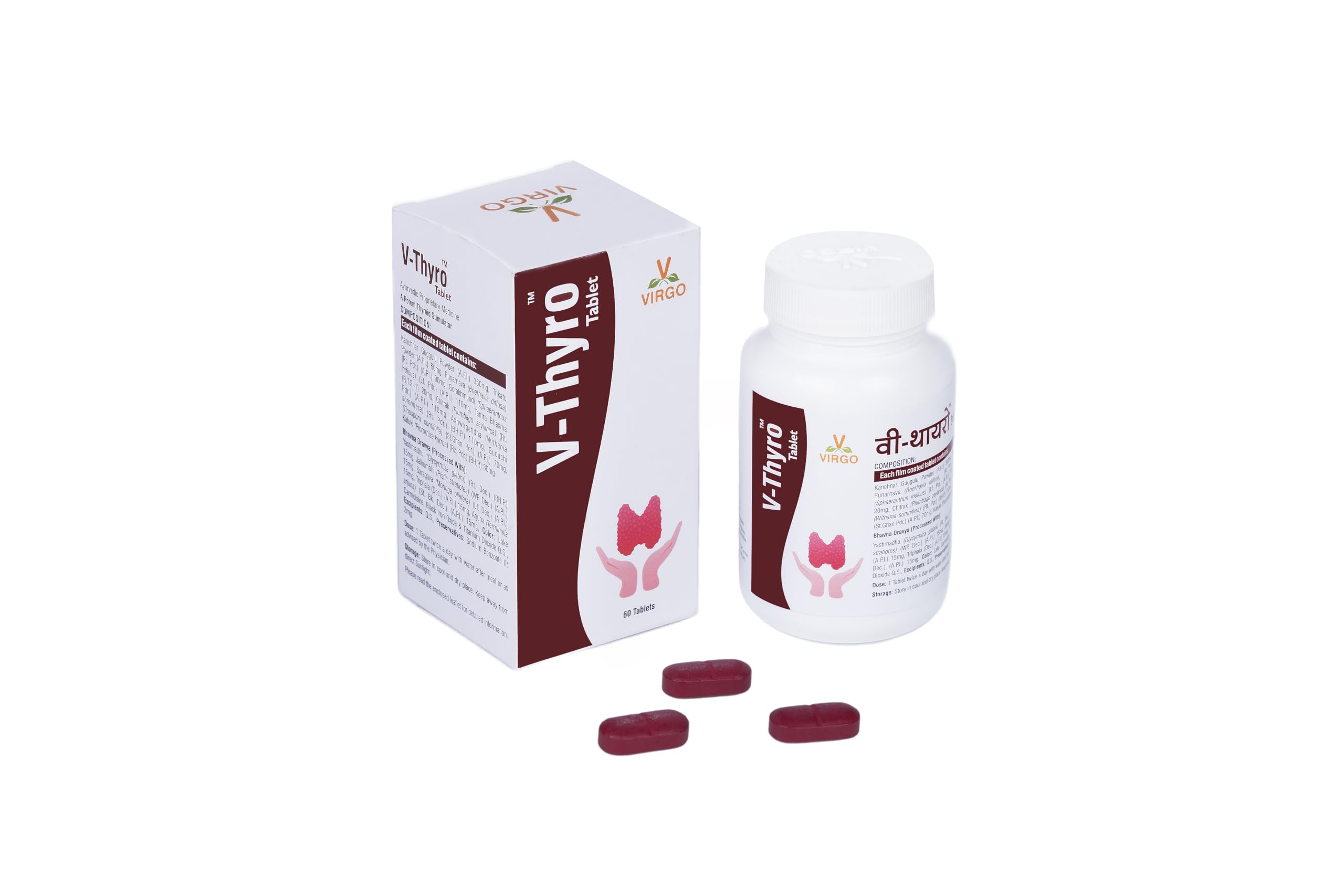 V-Thyro Tablet is Herbo-mineral combination of Thyroid gland Stimulator Metabolism booster and Anti-inflammatory ingredients which promotes natural function of Thyroid gland.