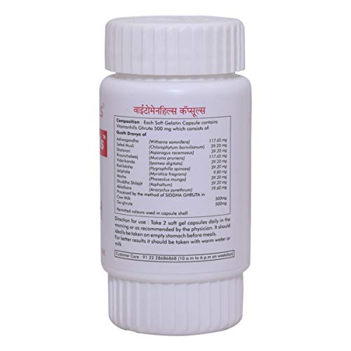 Siddha Ghruta 500 mg contains: Aswagandha 117.65mg Safed Musli 39.20mg Shatavari 39.20mg Krounchabeej 117.65mg Vidarikanda 39.20mg Kokilaksha 39.20mg Jatiphala 9.8mg Masha 39.20mg Shuddha Shilajit 39.20mg Akkalkara 19.60mg Cow - Milk 500mg Go - Ghruta (Siddha) 500mg
