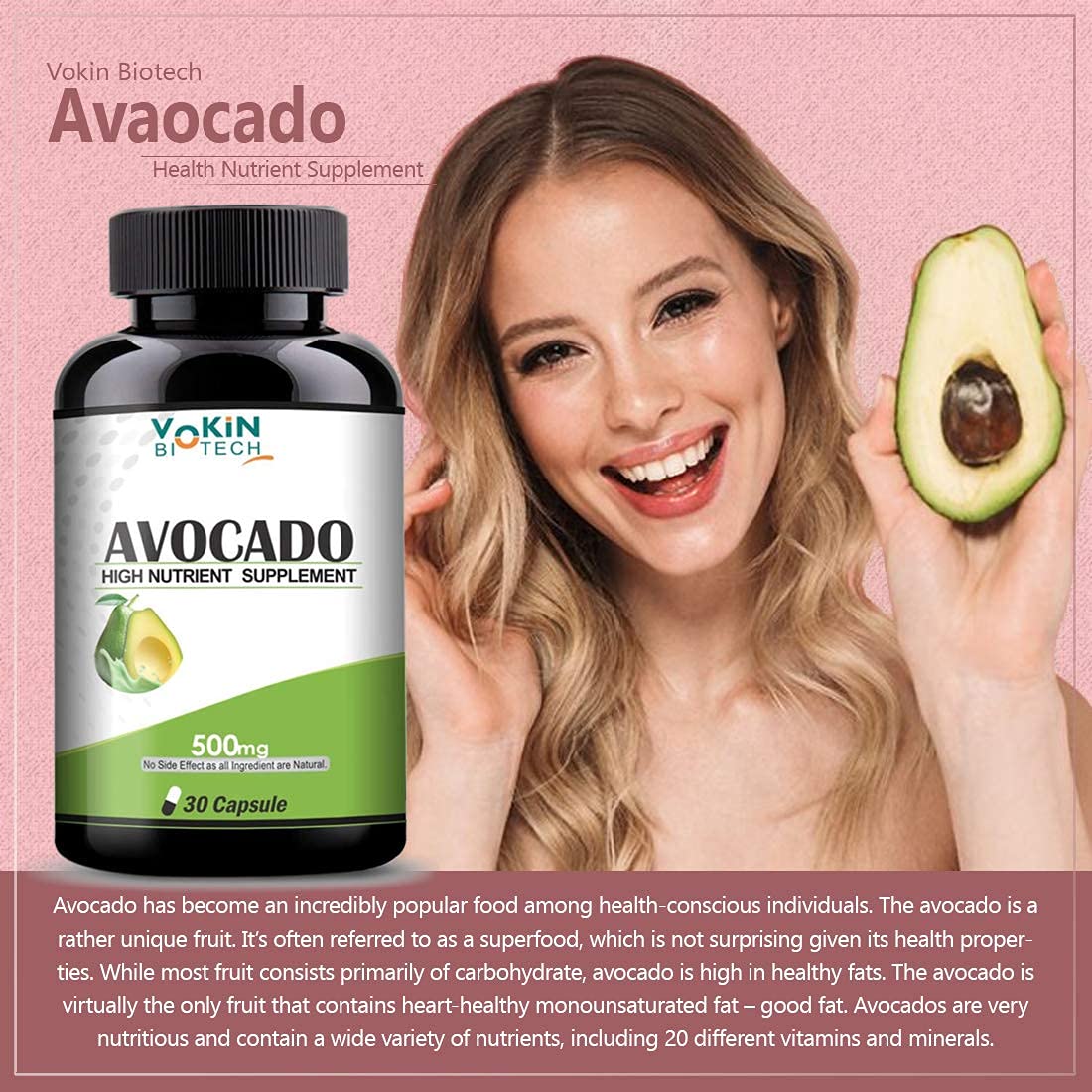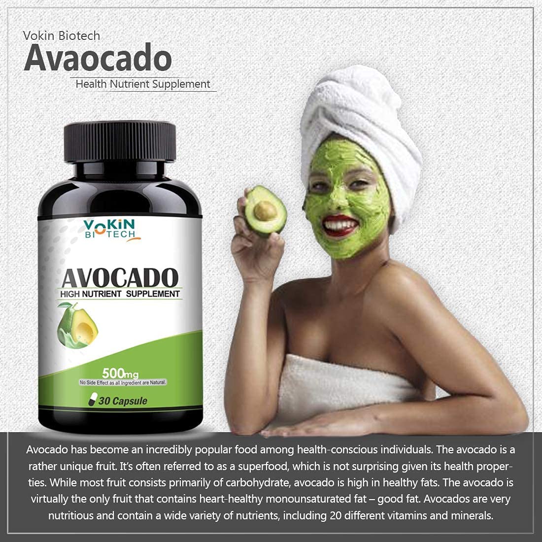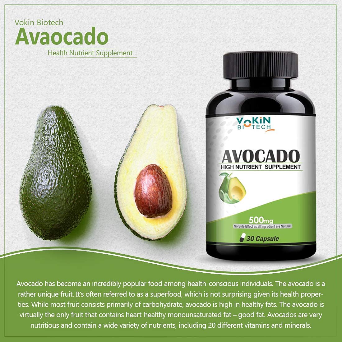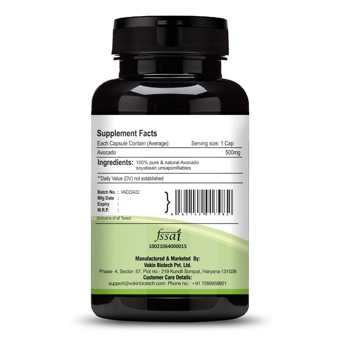Vokin Biotech 100% Avocado Capsule 500mg for Improves Cognitive Function and improve skin problem -Herbal Vegetarian (30 Caps)