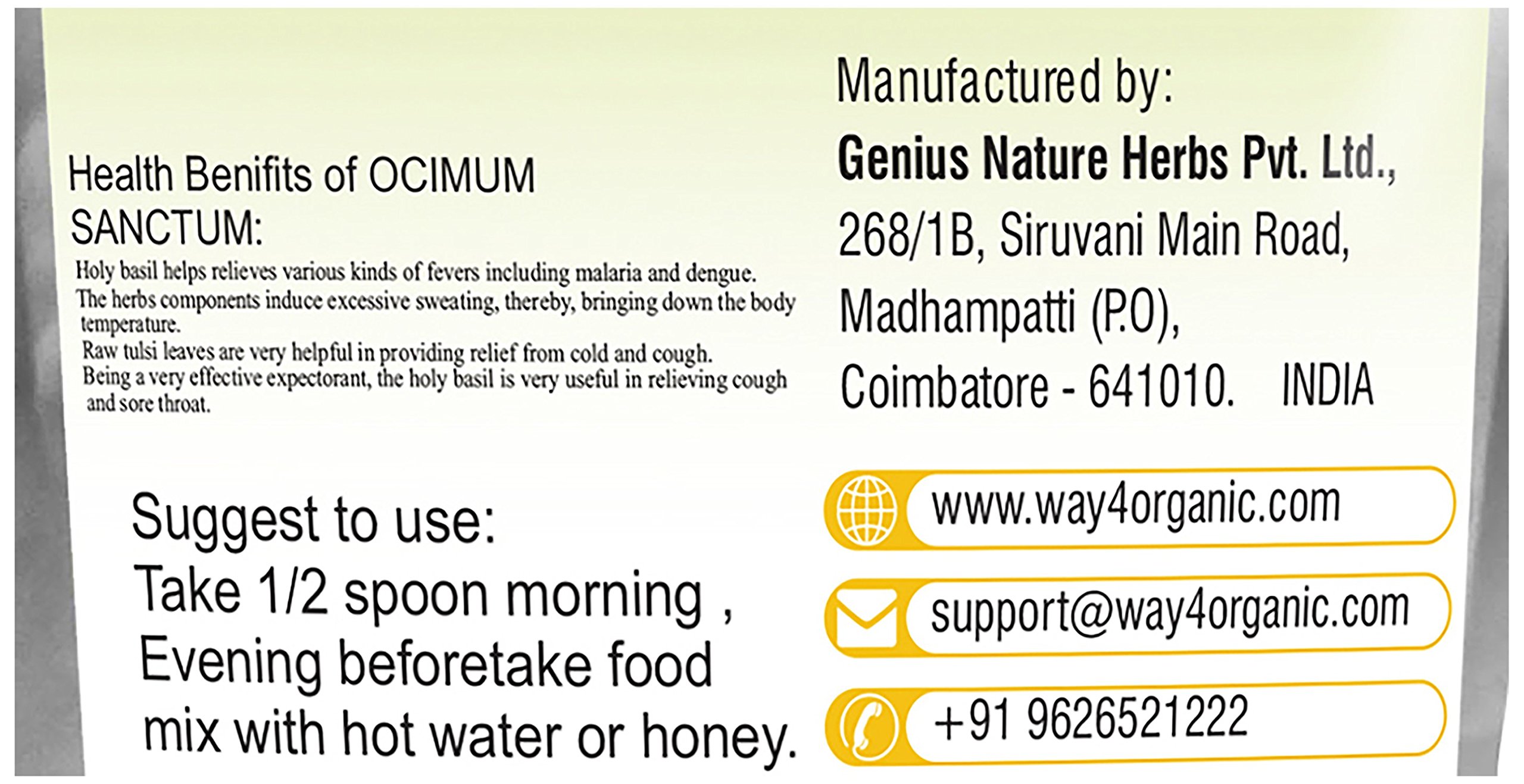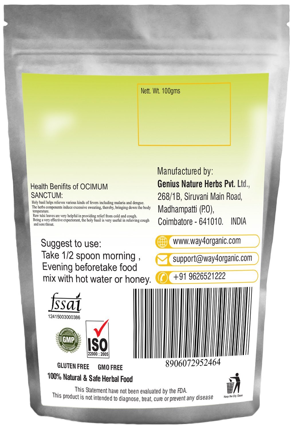 The raw powder in the display is 100% natural and safe herbal food and package content includes 1 pure ocimum sanctum raw powder. This raw powder enhances overall health immune system and is basically used for anti aging purpose. It is recommended to keep the product away from children's reach and store in cool dry place and avoid direct contact from sunlight.