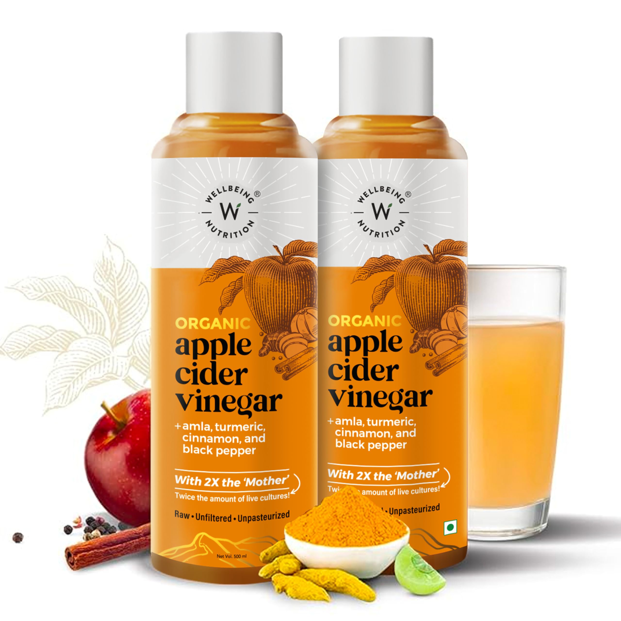 Wellbeing Nutrition Apple Cider Vinegar with Turmeric, Amla, Cinnamon and Black Pepper | Raw Unfiltered with 2X The Mother | Weight Management, Boost Immunity & Detox, Skin Health | 500ml - Pack of 2