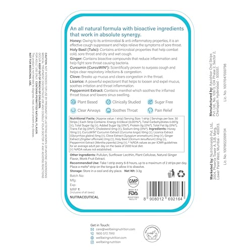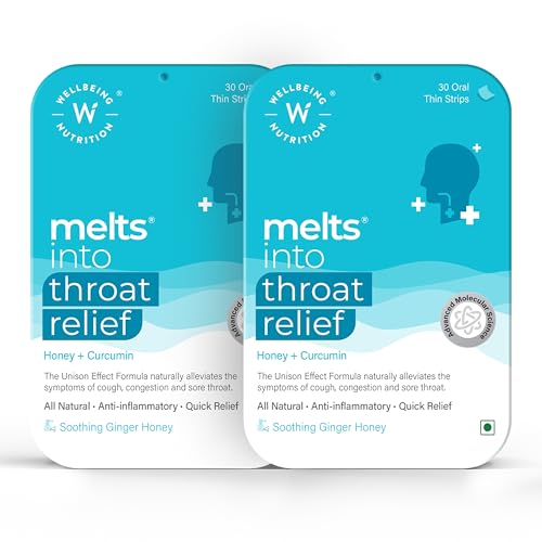 Wellbeing Nutrition Melts Instant Throat relief formulated with Pudina/Mint Manuka Honey Sweet Violet Dry Ginger extract Curcumin Clove Licorice and Holy Basil/Tulsi to deliver a precise dose of bioactive ingredients. Melts oral strips are clinically proven and 100% bioactive using patented German Nano Technology to help you beat wet or dry cough relief low immunity Cold and Cough relief chest congestion relief respiratory infections and also boost the lysozymes count in your saliva which increases immunity and reduces respiratory problems while keeping the lungs cleaner. Clinically proven and formulated using only natural ingredients that help provide immediate relief from sore throat. Take this melts strip to: Get Cough Relief | Clear Congestion | Soothe Your Throat | Clear Airways | Get Relief from Respiratory Issues. Available in a tasty and soothing Ginger Lemon Honey flavour | 100% Organic and Vegan | Precise Dose | Zero Sugar | No Preservatives | No Gluten/Soy/Nuts | No Water Needed | No Swallowing Difficulties