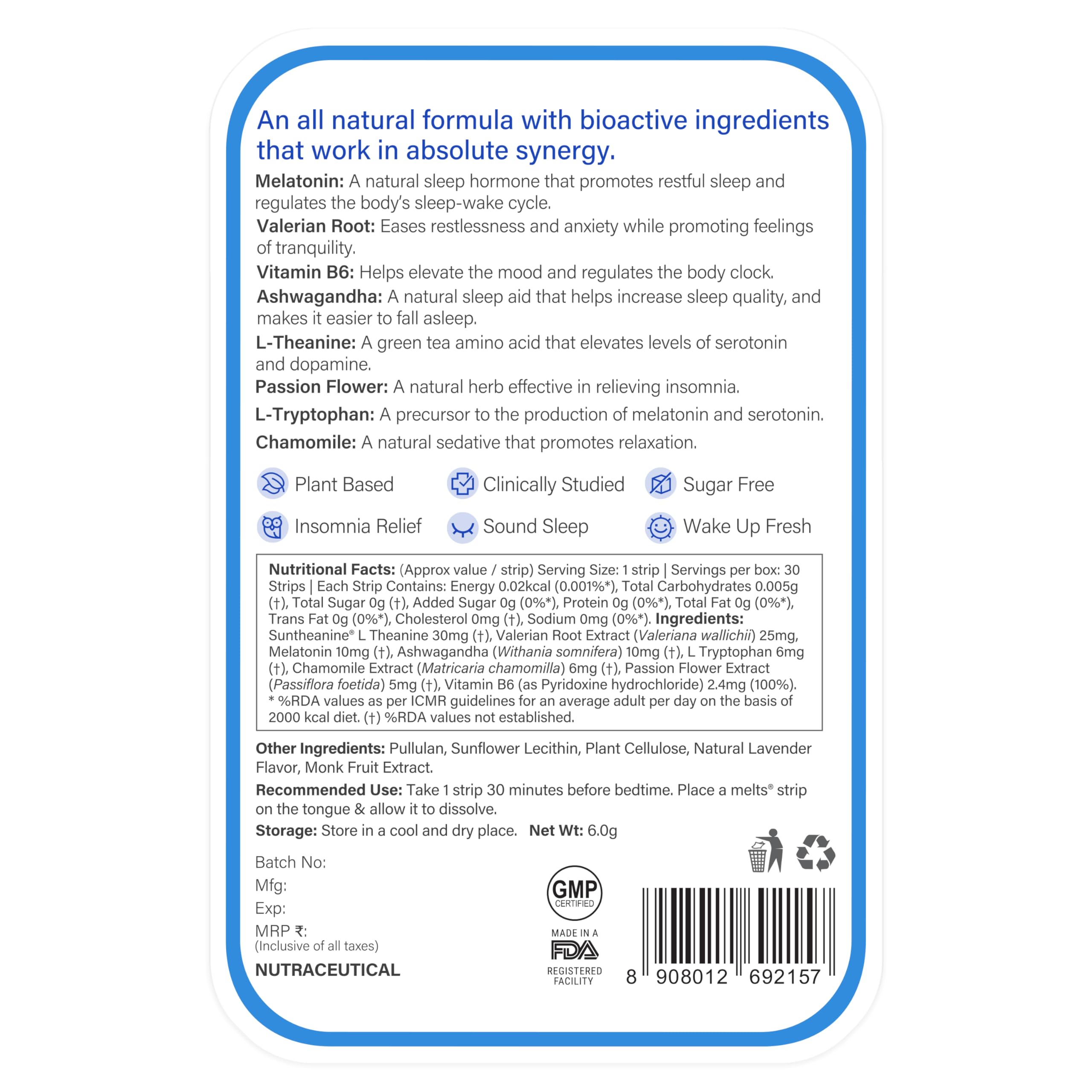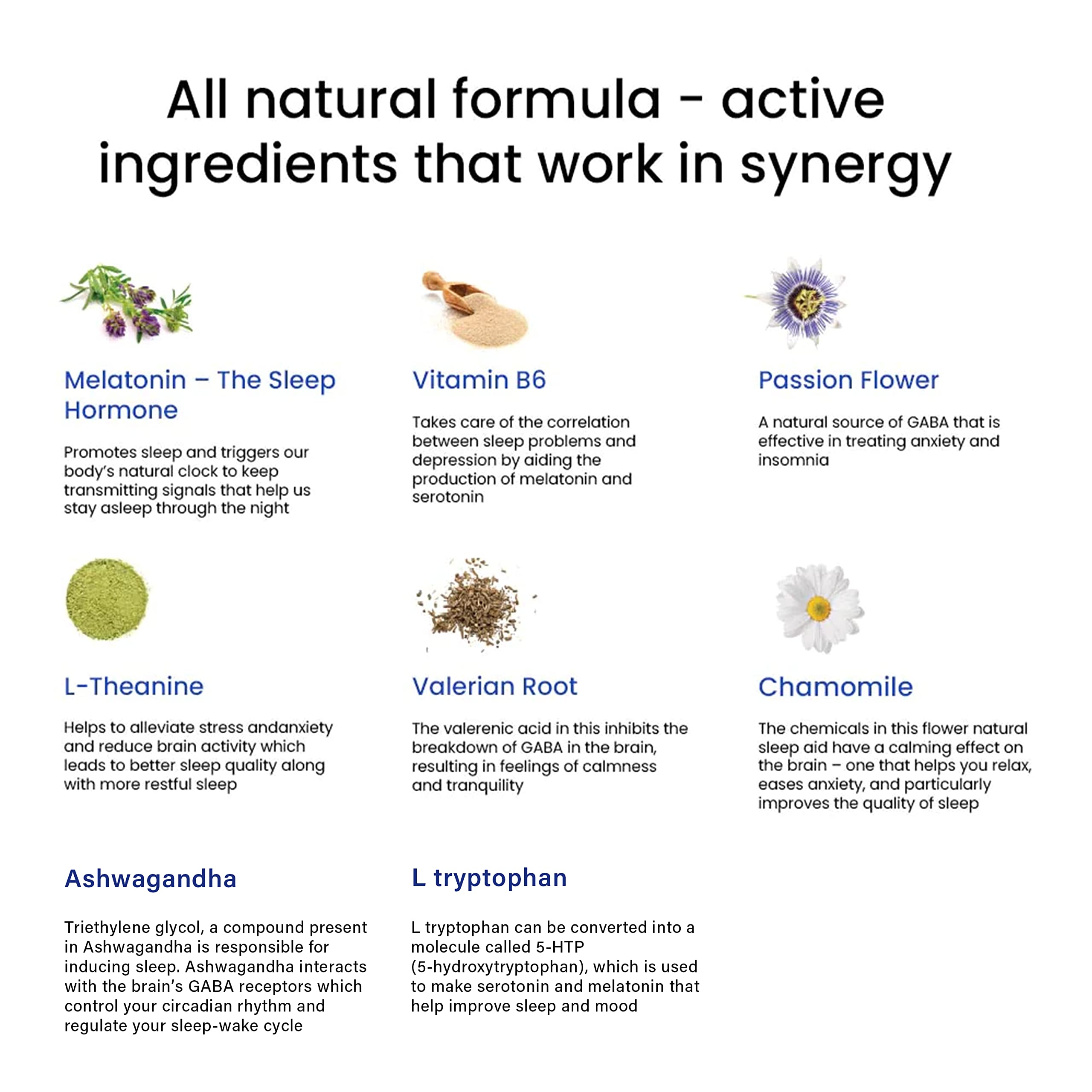 FAST-ACTING INGREDIENTS FOR UNINTERRUPTED SLEEP: L-Theanine reduces brain activity lowers mental stress and ensures deep sleep. L- tryptophan can be converted into a molecule called 5-HTP (5-hydroxytryptophan) which is used to make serotonin and melatonin