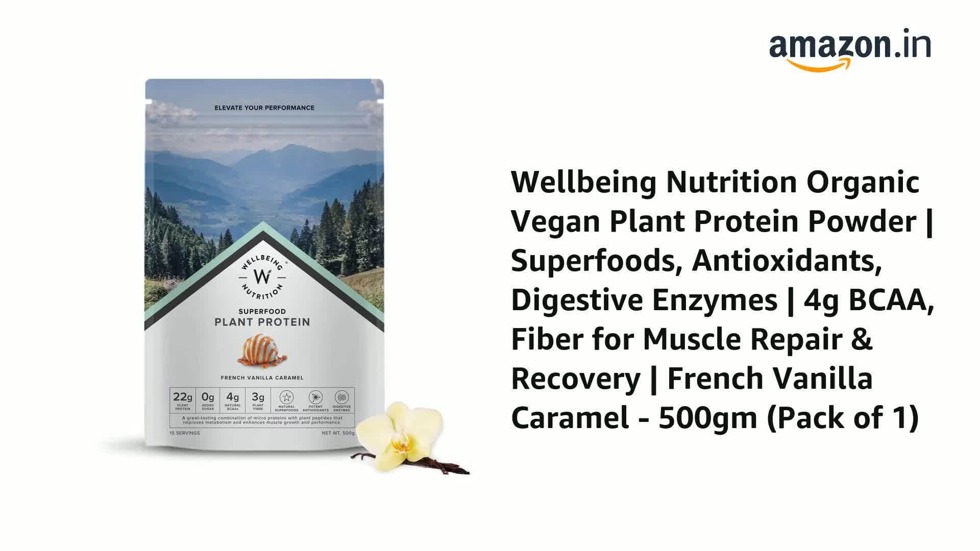 Wellbeing Nutrition Organic Vegan Plant Protein Isolate| 22g Protein, 5g BCAA, 3B CFU Probiotics, Digestive Enzyme, 3g Fiber, Alkalizing Green| NO Bloat, Easy to Digest| French Vanilla Caramel 500gm
