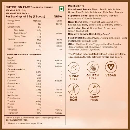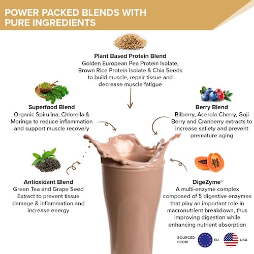 • SUPERIOR PROTEIN FOR MUSCLE GROWTH & REPAIR : With 22 grams of pure protein sourced from European Pea Protein Isolate Brown Rice Protein Isolate and Chia Seeds this plant protein is an excellent post workout companion with a complete amino acid profile th