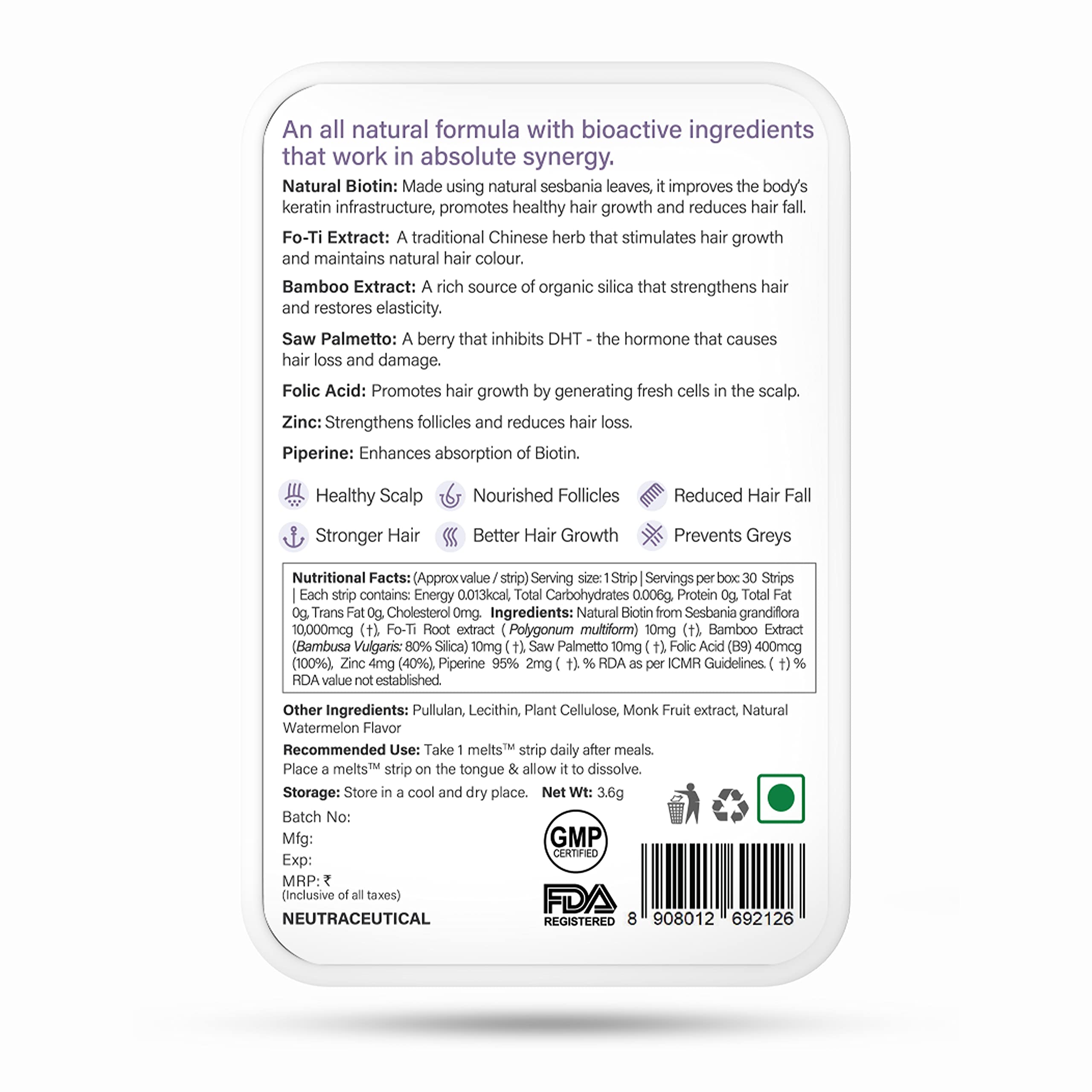 • Clinically-validated & Plant-based Biotin: With 100% Plant-based high absorption natural 10000 mcg Biotin made from Sesbania Agati leaves Healthy Hair melts improves the body's keratin infrastructure promotes healthy hair helps reduce dryness and increase