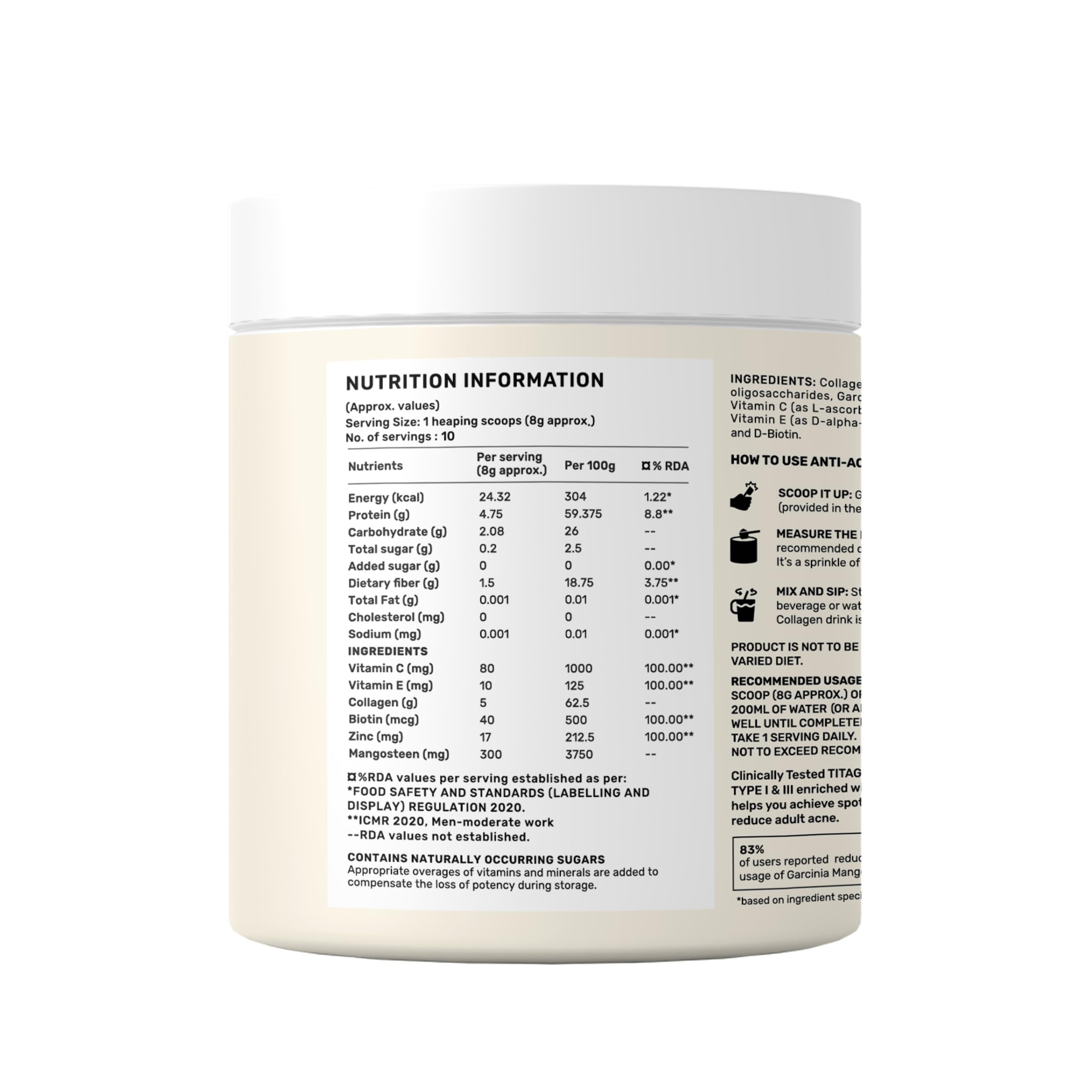 What's Up Wellness Anti-Acne Collagen|Certified Marine Titagen Collagen with Mangosteen & Biotin|Reduces Adult Acne|For Men & Women|Unflavoured|10 days Serving powder 1 count 25 Servings