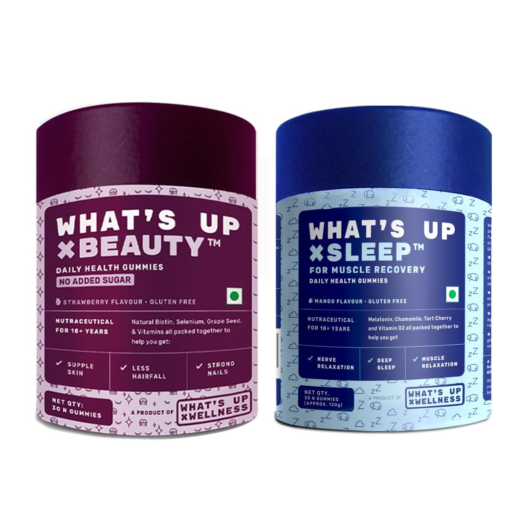 What's Up Wellness Beauty & Sleep Combo | Natural Biotin for Strong Hair Vitamin A B6 and C for Bright Skin + Melatonin Gummies with Tart Cherry for Peaceful Sleep and Muscle Recovery | 30 Days Serving | No Side Effects
