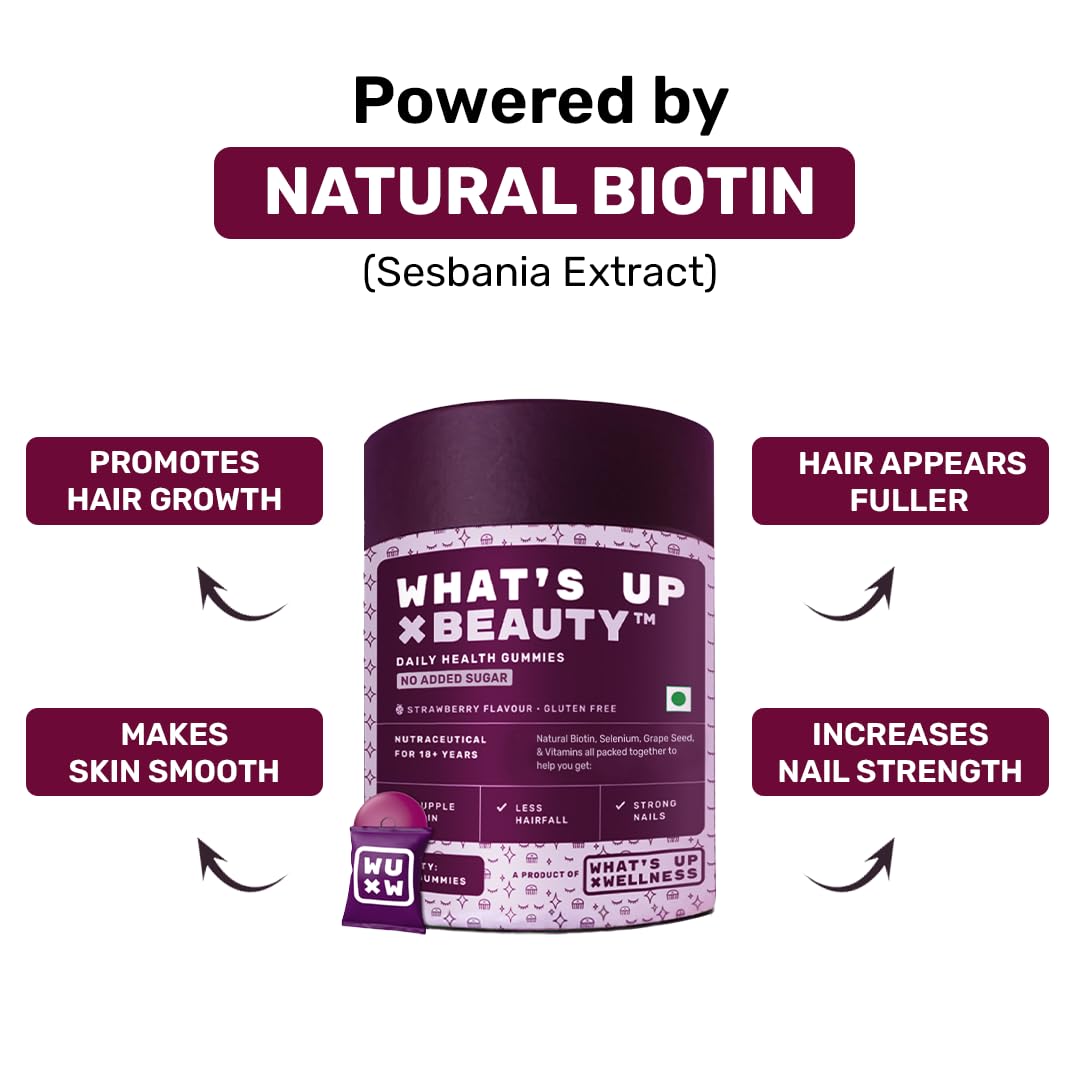 HomeHealth & PersonalDiet & NutritionHealth SupplementsWhat's Up Wellness Beauty & Sleep Combo | Natural Biotin for Strong Hair Vitamin A B6 and C for Bright Skin + Melatonin Gummies with Tart Cherry for Peaceful Sleep and Muscle Recovery | 30 Days Serving | No Side Effects