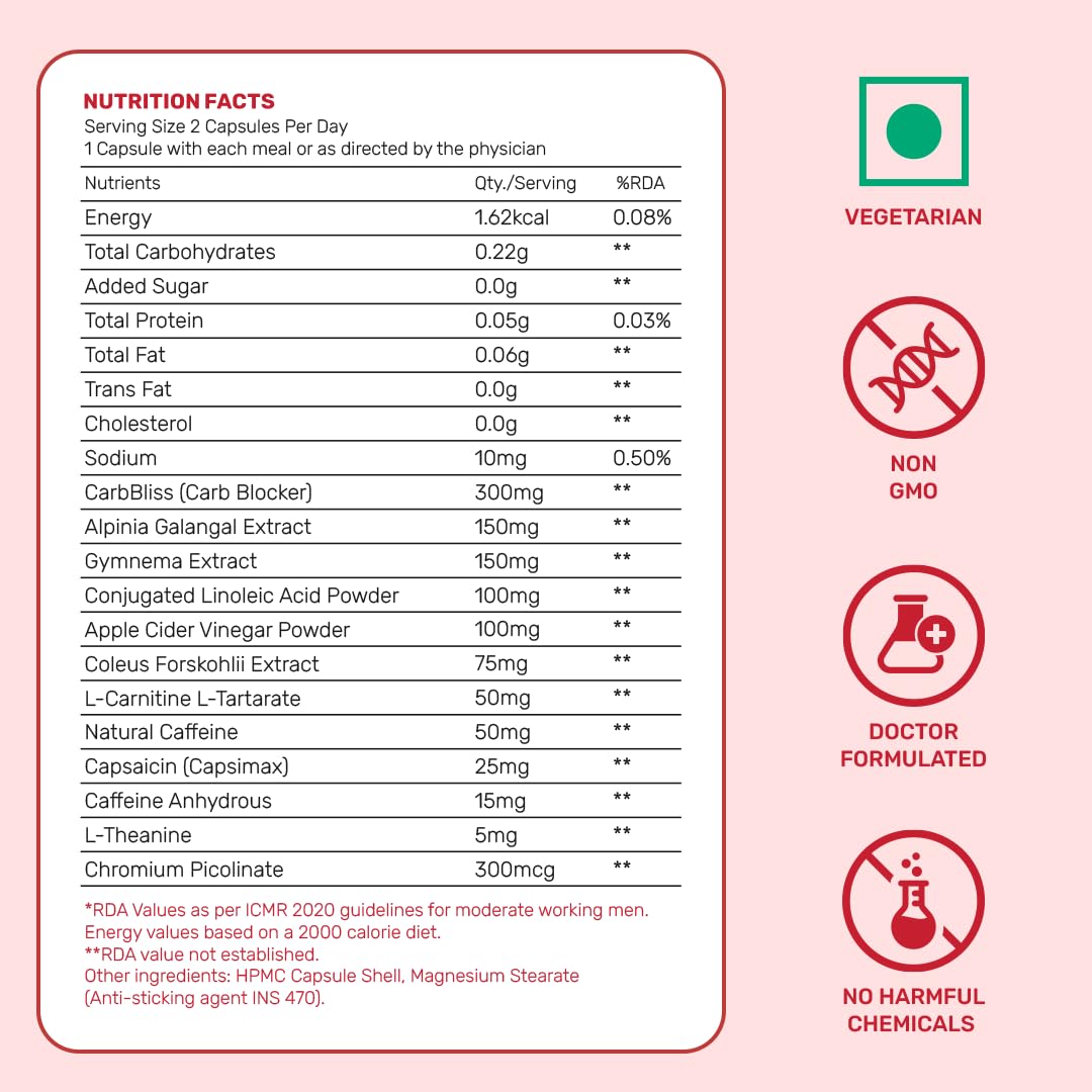 Daily Burner by What's Up Wellness powered with Capsimax is popularly known for jacking up your metabolic rate and enhancing energy expenditure both during physical activity and at rest. Taking this incredible ingredient before your workout amplifies your overall calorie burn throughout the day. This enriched with the prowess of CarbBliss Apple Cider Vinegar CLA L-Theanine and Caffeine will ensure you achieve your fittest self.