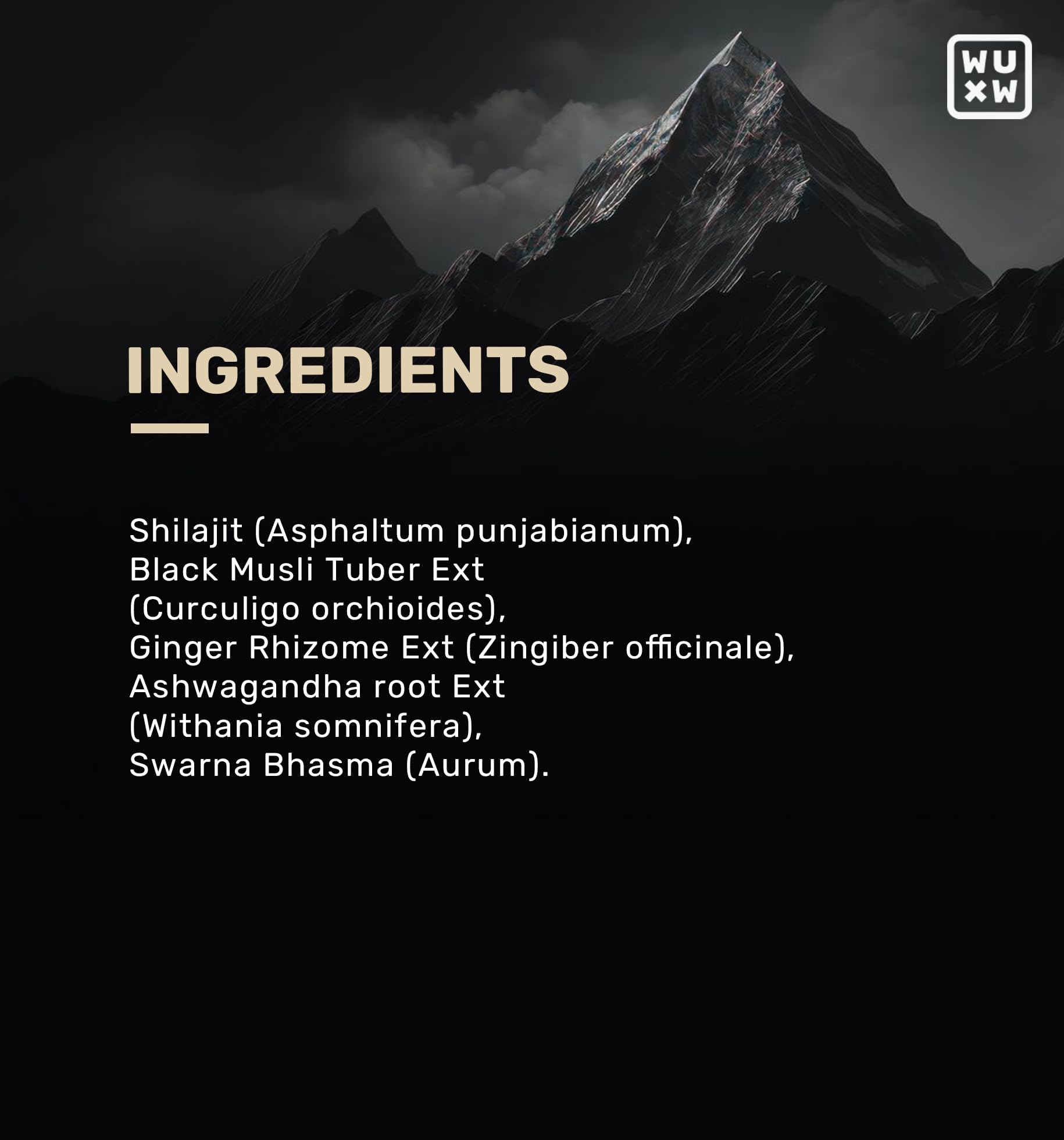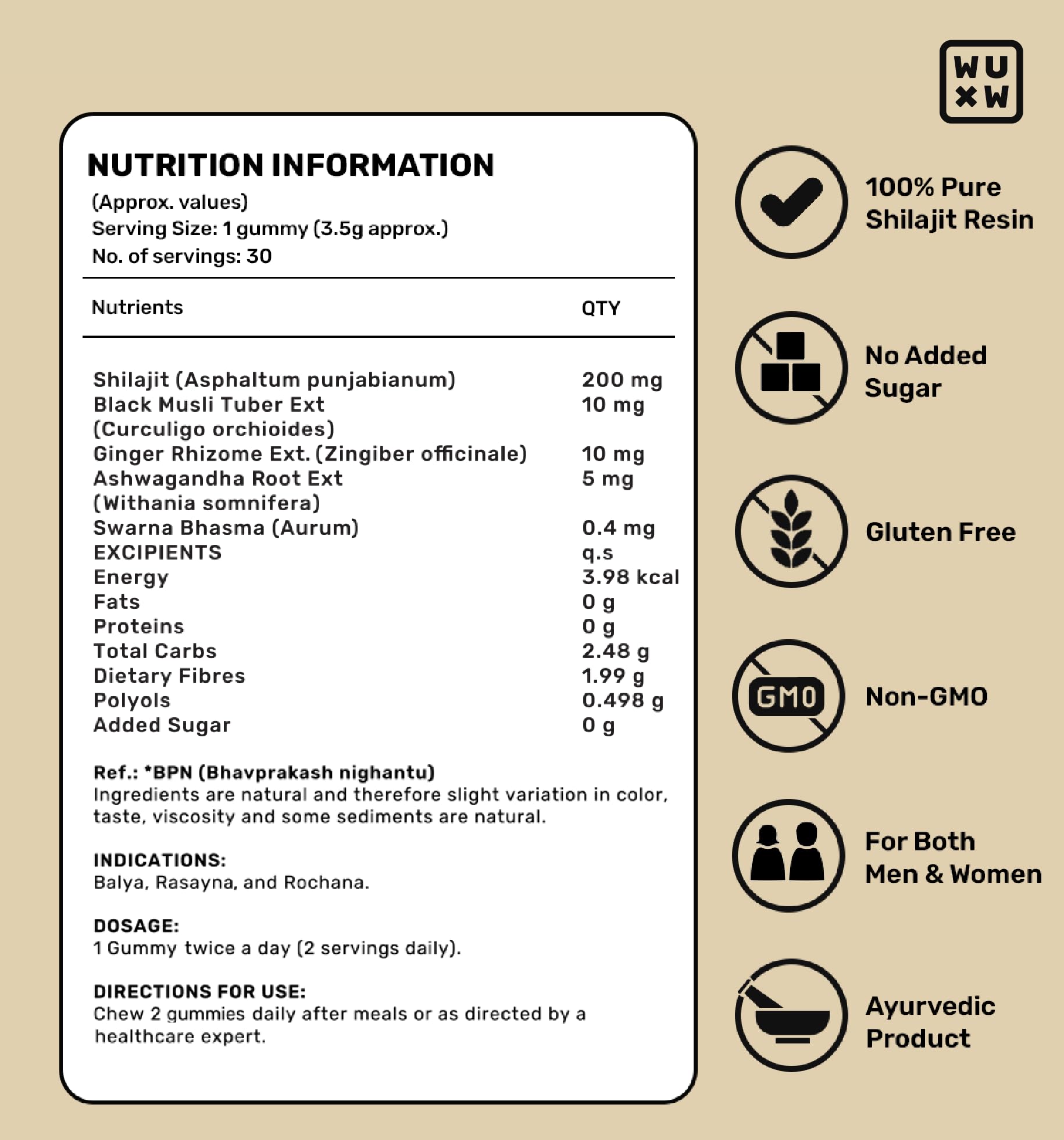 WHAT'S IN IT: What's Up Wellness Shilajit Resin Gummies contain 200 mg purified Shilajit (Asphaltum Punjabianum) with 24 Carat Gold Dust (Swarna Bhasma) Ashwagandha Ginger Extract and Black Musli. These natural ingredients are rolled into one gummy in a s