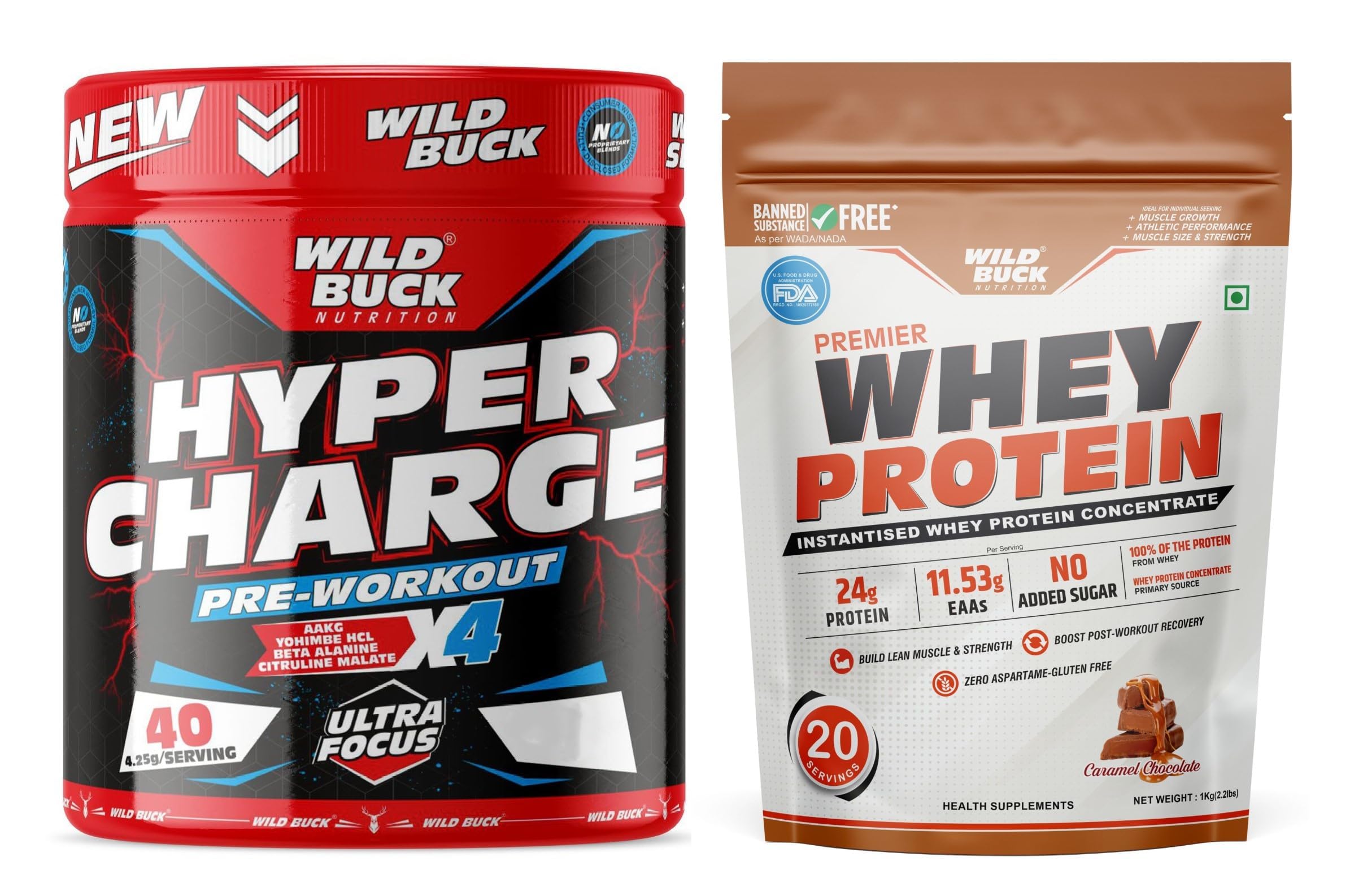 The WILD BUCK Hyper Charge X4 Pre-workout : Designed to elevate your energy focus power output and performance levels it will help you power through every training session and prime you for harder heavier and more productive lifts. With so many ingredients dedicated to powering up your results The WILD BUCK Pre-workout is in a league of its own. Stop leaving gains on the table. Start making the most of your workouts today with The WILD BUCK Pre-workout the lifting partner youâve been looking for. Serving: For Insane Workout - Take One Scoop with 150-200ml of water and drink 10-20 minutes before action. For Hardcore Workout - Take half Scoop with 150-200ml of water and drink 10-20 minutes before action. WILD BUCK Whey Protein is packed with Protein Glutamic Acid BCAA & Other EAAS. The primary source is whey protein concentrate which is loaded with health-boosting bioactive compounds along with natural phospholipids for quick recovery and sustained results.