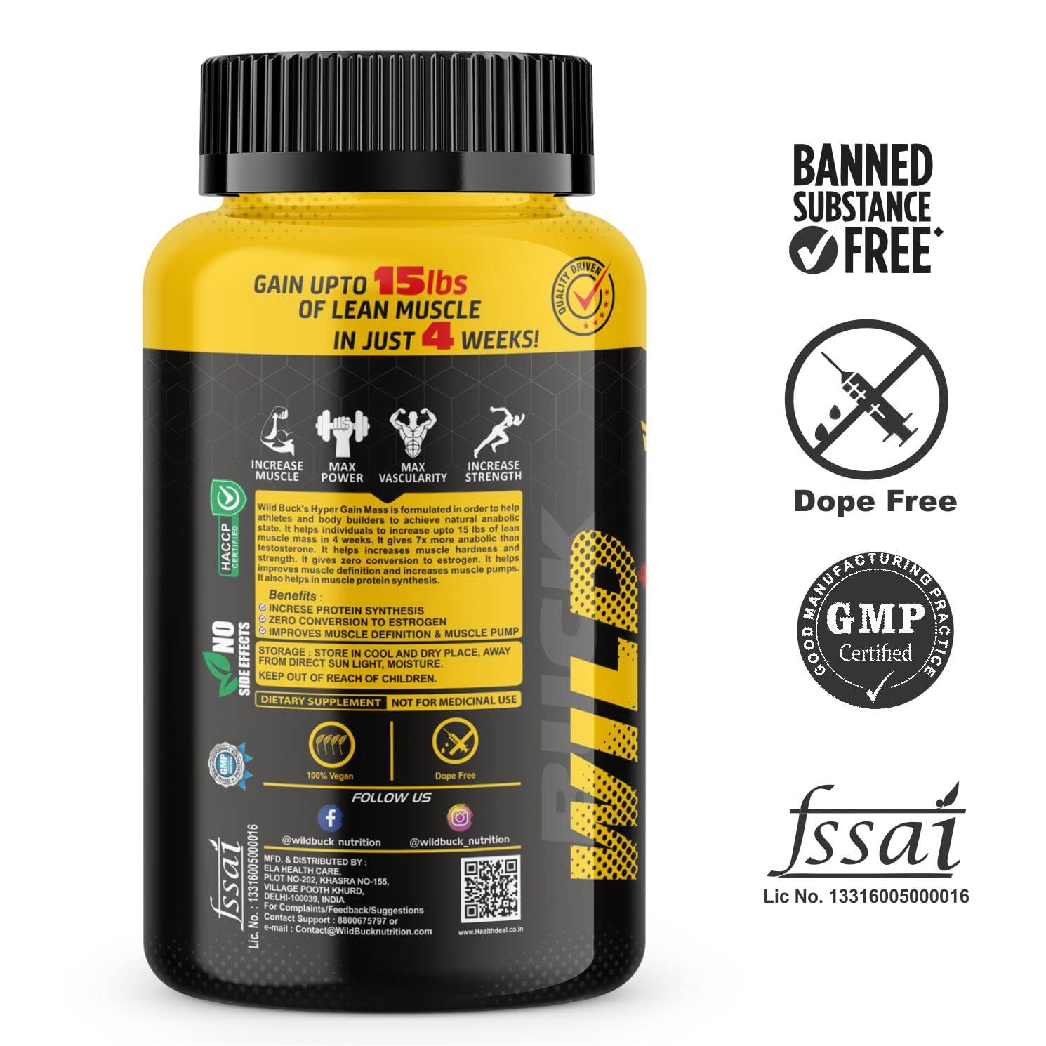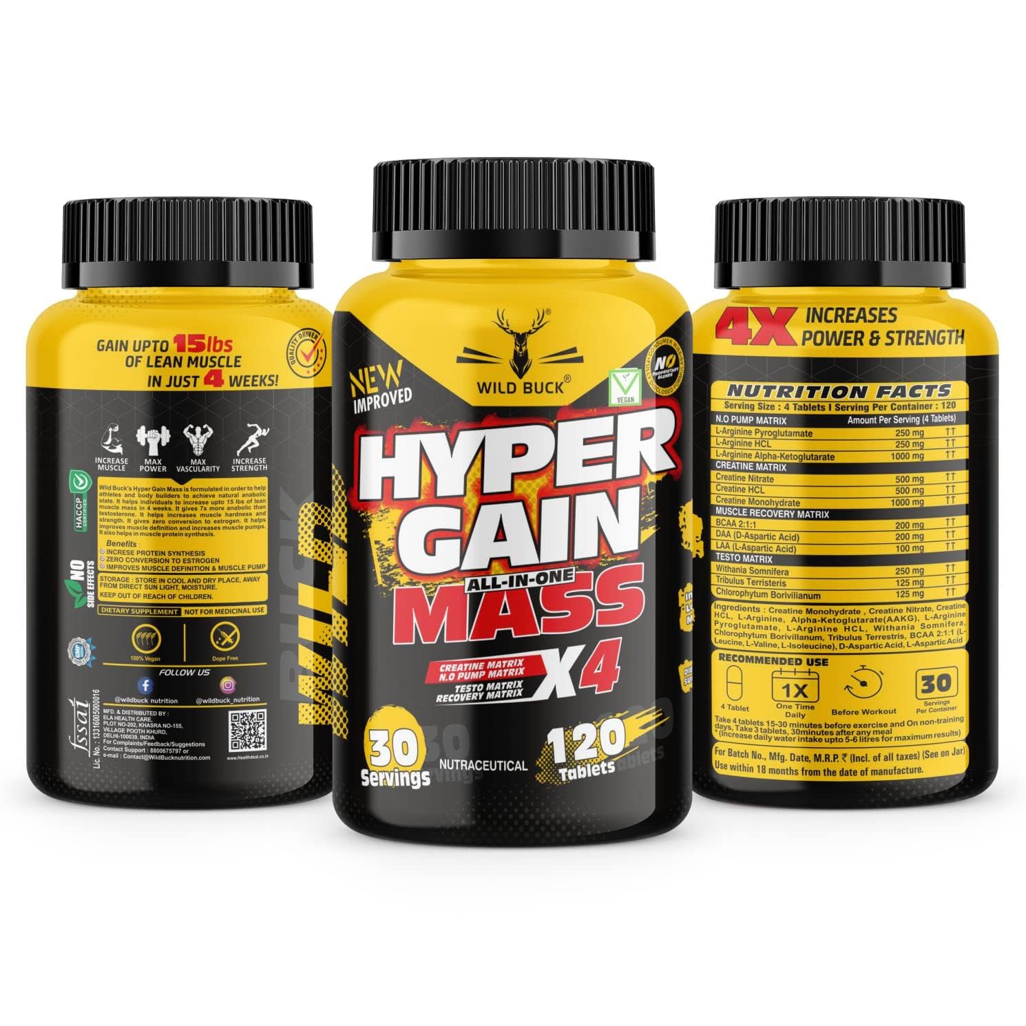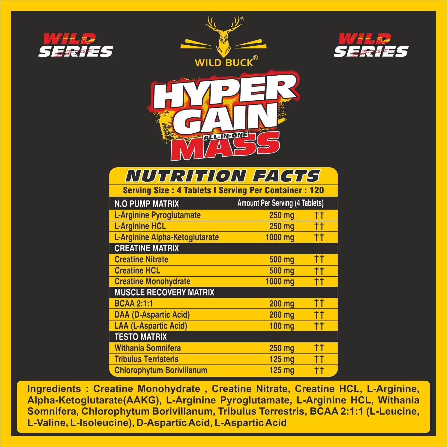 Wild Buck's Hyper Gain Mass is formulated in order to help athletes and body builders to achieve natural anabolic state. It helps Individuals to increase up to 15 lbs of lean muscle mass in 4 weeks. It gives 7X more anabolic than testosterone. It helps increases muscle hardness and strength. it gives zero conversion to estrogen. It helps improves muscle definition and increases muscle pumps.'. It also helps In muscle protein synthesis.