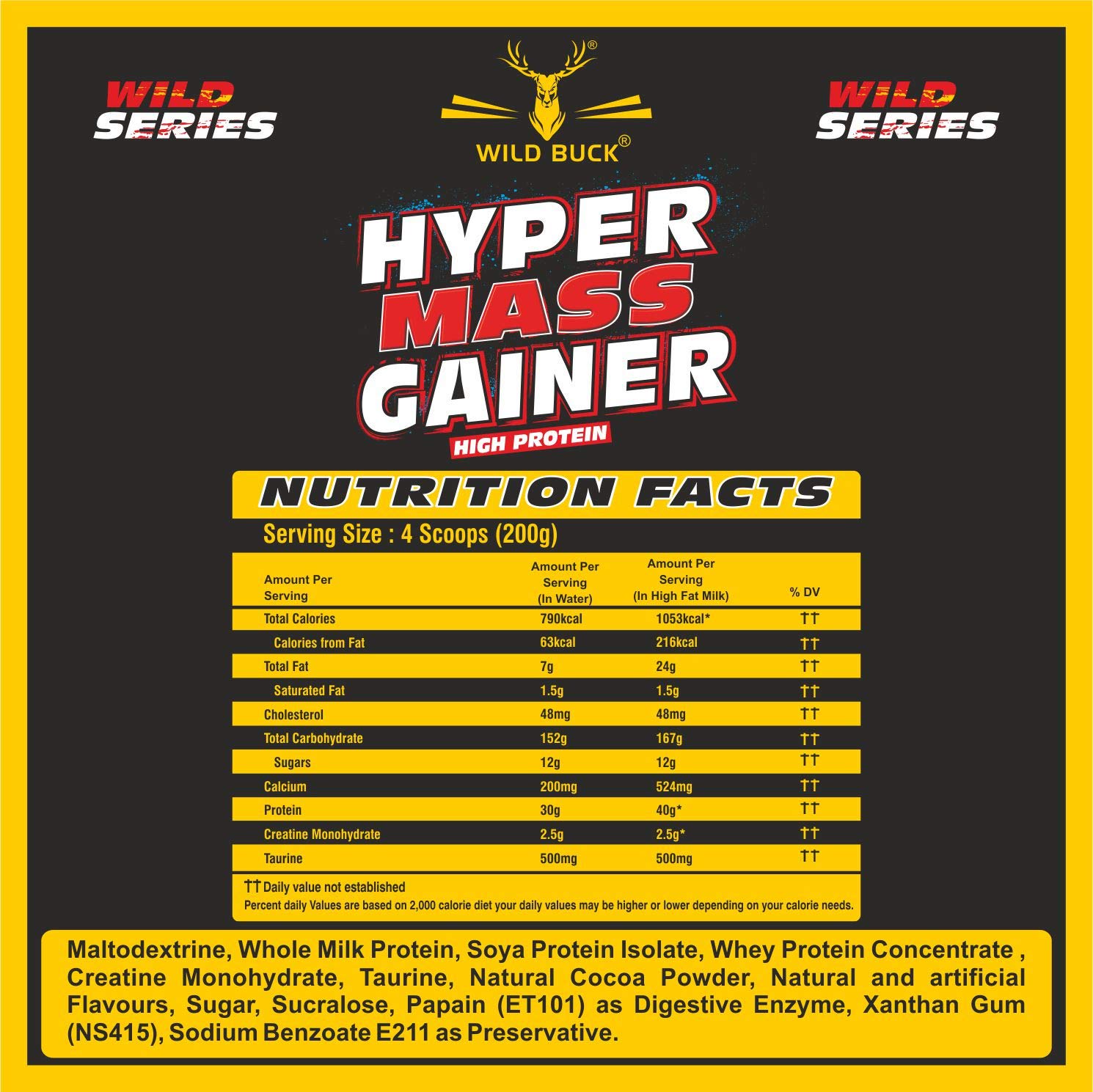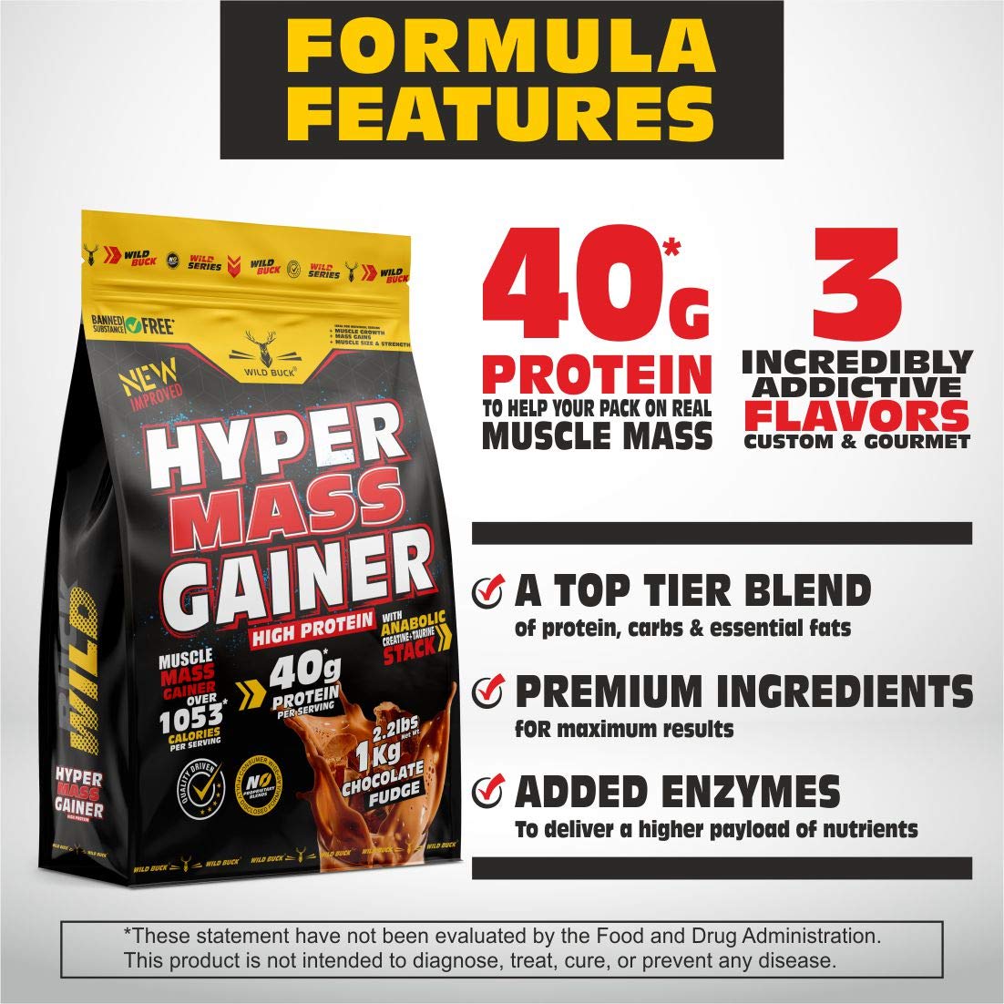 HomeHealth & PersonalDiet & NutritionHealth SupplementsWild Buck Hyper Mass Gainer High Protein Muscle Mass Gainer with Creatine + Taurine1053 Calories & 40g Protein Gain Strength & Size Weight Gainer for Men & Women [Chocolate Fudge 1 Kg / 2.2 lb]