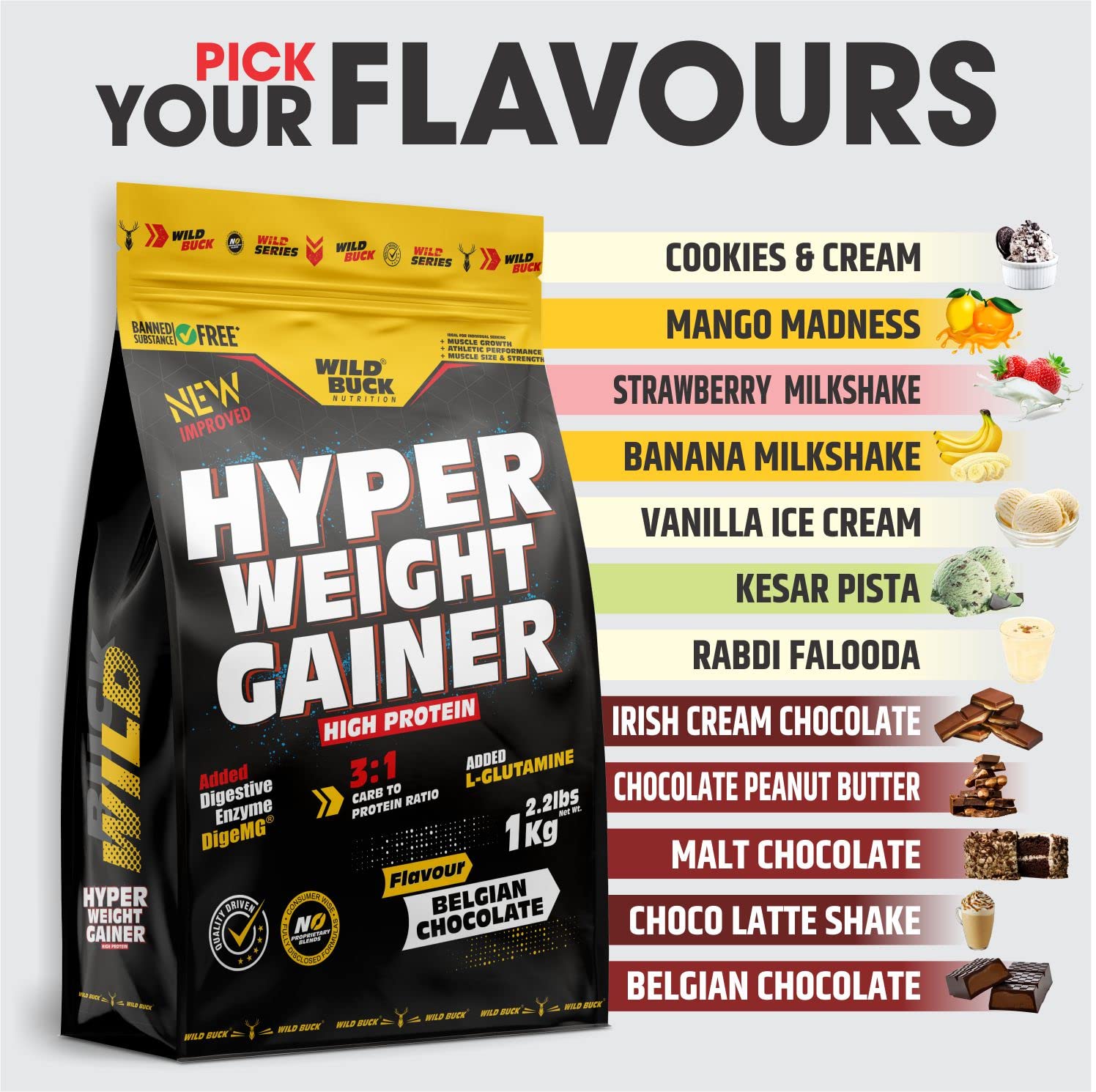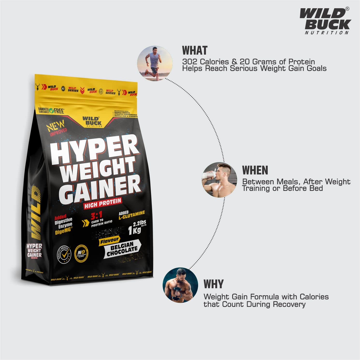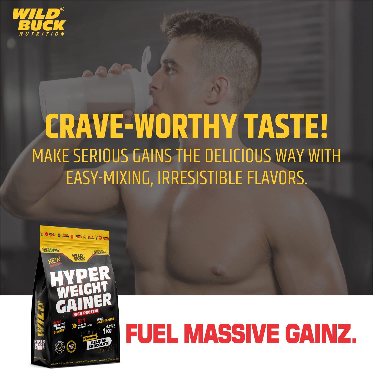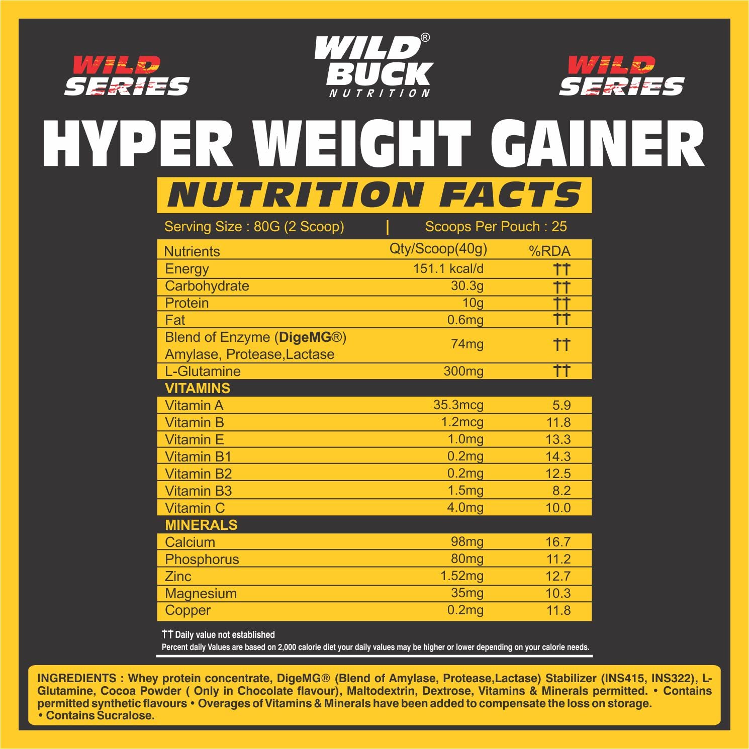 Hyper Weight Gainer is perfect for "hard gainers" -- those are the athletes who find it hard or next to impossible to gain weight. It is a high-calorie bodybuilding shake fortified with muscle building protein carbohydrates glutamine and essential nutrients. Hyper Weight Gainer makes it easy for you to get lots of calories and the highest quality muscle-building protein for gaining weight fast in one delicious shake. Hyper Weight gainer can be used as a Post-Workout drink. It's high-calorie body building food with muscle building protein carbohydrates and glutamine. Wild Buck Hyper Weight Gainer is Crucial in helping the body support muscle recovery from hardcore training as well as promote muscle growth. Use in the morning between major meals or post-workout.