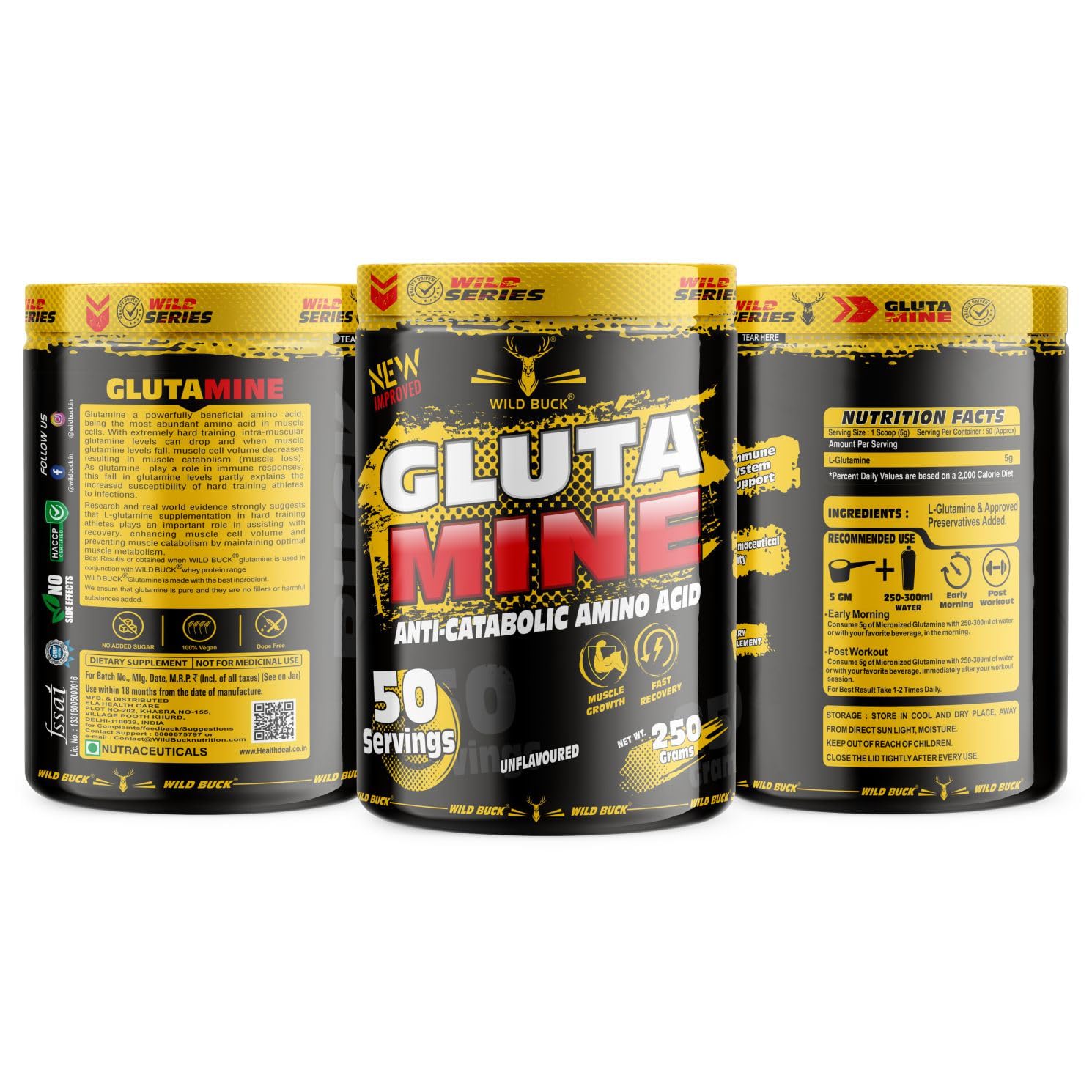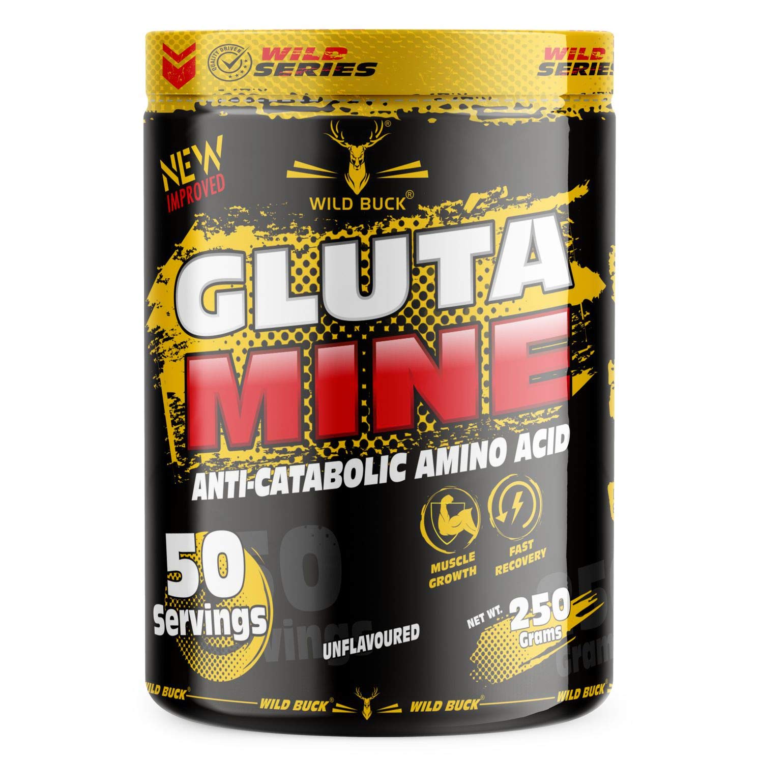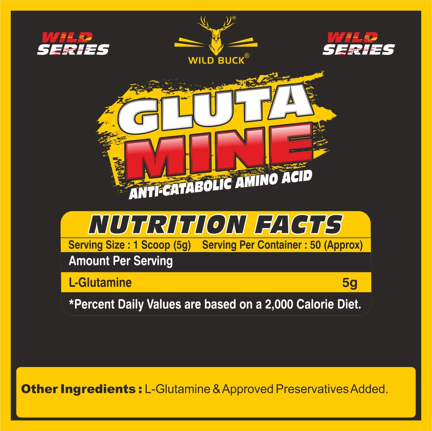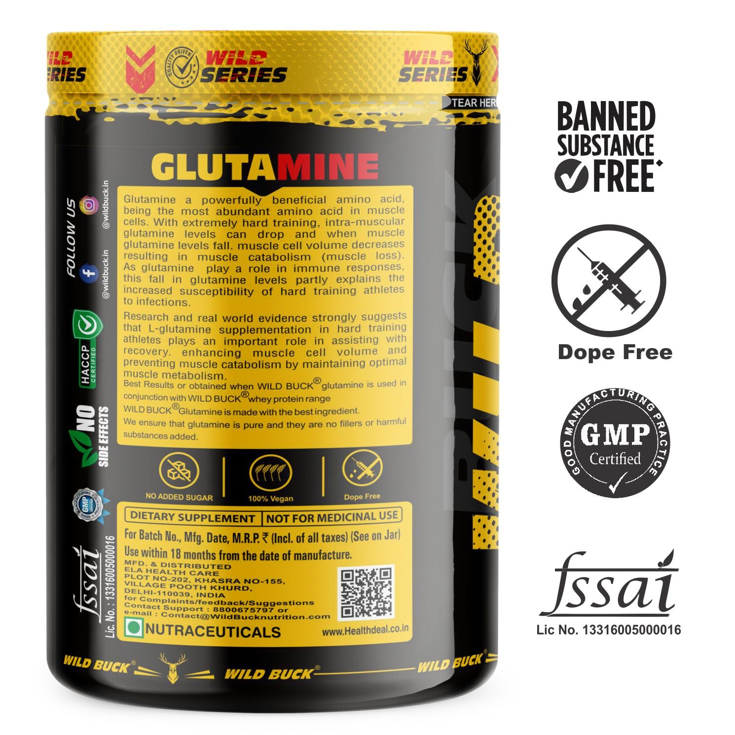 âGlutamine is the most abundant amino acid in the body comprising more than 60% of the free amino acid pool in skeletal muscle and greater than 20% of total circulating amino acids. Supplemental L-Glutamine may help reduce muscle soreness and rebuild muscle tissue. It BOOSTS POST EXERCISE RECOVERY AND PERFORMANCE. WILD BUCK micronized glutamine is an essential amino acid that helps balance the levels of amino acids in the body during intense workouts to prevent muscle loss and help in faster muscle recovery post workout. Glutamine also aids in water retention to prevent dehydration causing fatigue post strenuous workouts. Glutamine also helps muscle synthesis and provides energy to perform longer workouts. During the process of bodybuilding people consume various supplements and perform exercises beyond their daily activities. These things stress up the liver and the immune system thus making the person at risk of catching various infections. When taken regularly according to suggested serving glutamine helps strengthen the immune system and fight physical stress thus maintain an overall healthy body. For best results it is advised to consume 5g of micronized glutamine with your favourite beverage in the morning or immediately post workout.