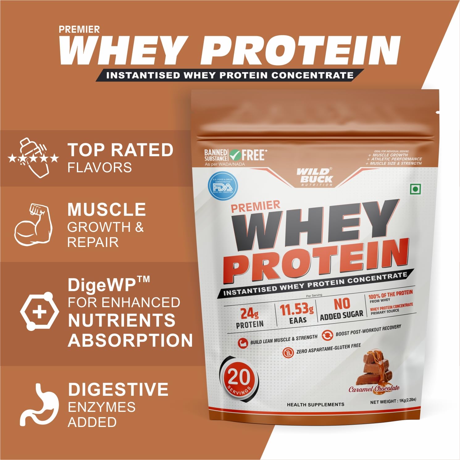 WILD BUCK Premier Whey Protein Concentrate 100% 24G High Protein 5.43G Bcaa 11.53G Eaa & Added Digestive Enzymes For Recovery & Muscle Growth | For Men & Women [1Kg Caramel Chocolate]