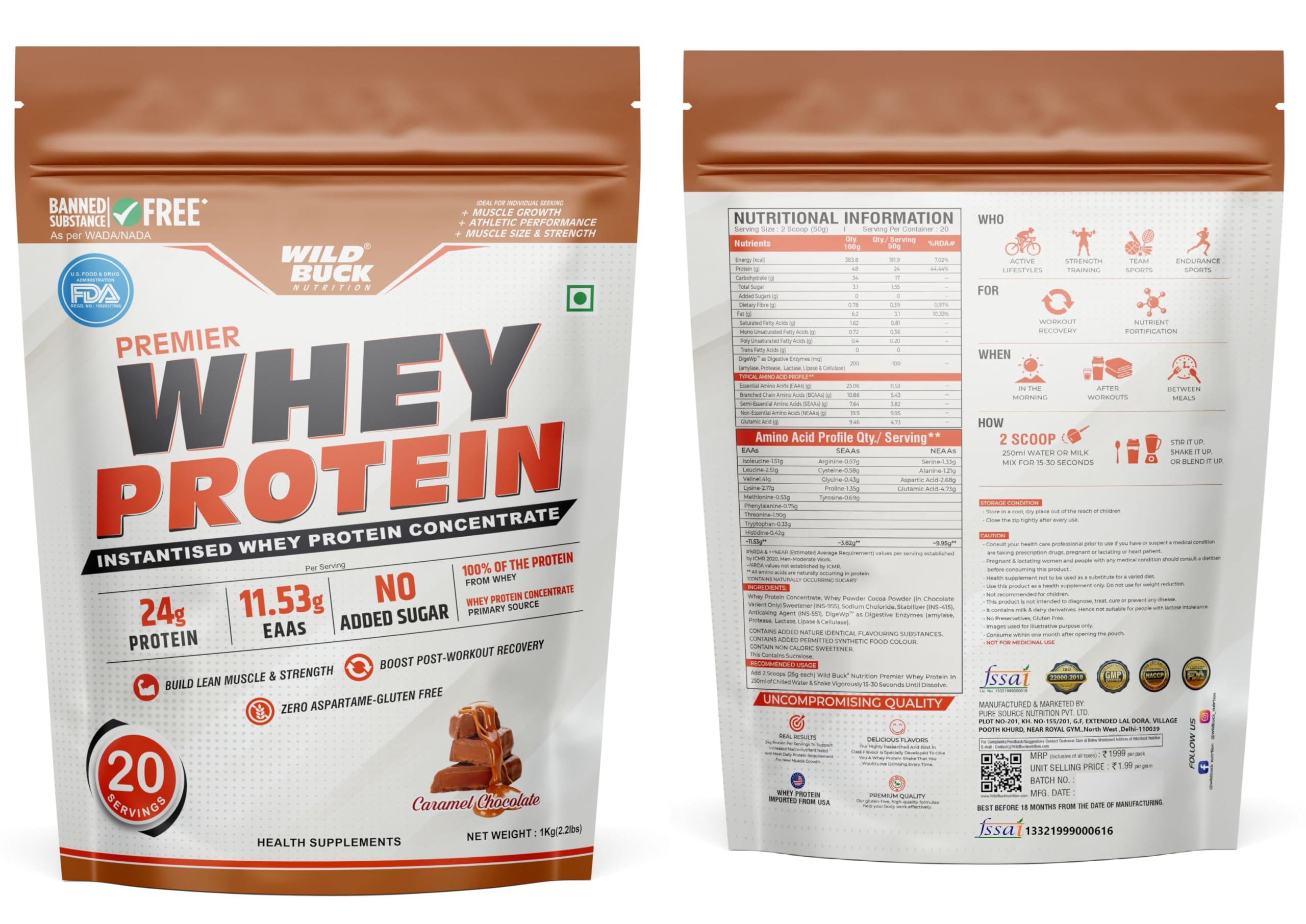 HomeHealth & PersonalDiet & NutritionHealth SupplementsWILD BUCK Premier Whey Protein Concentrate 100% 24G High Protein 5.43G Bcaa 11.53G Eaa & Added Digestive Enzymes For Recovery & Muscle Growth | For Men & Women [1Kg Caramel Chocolate]