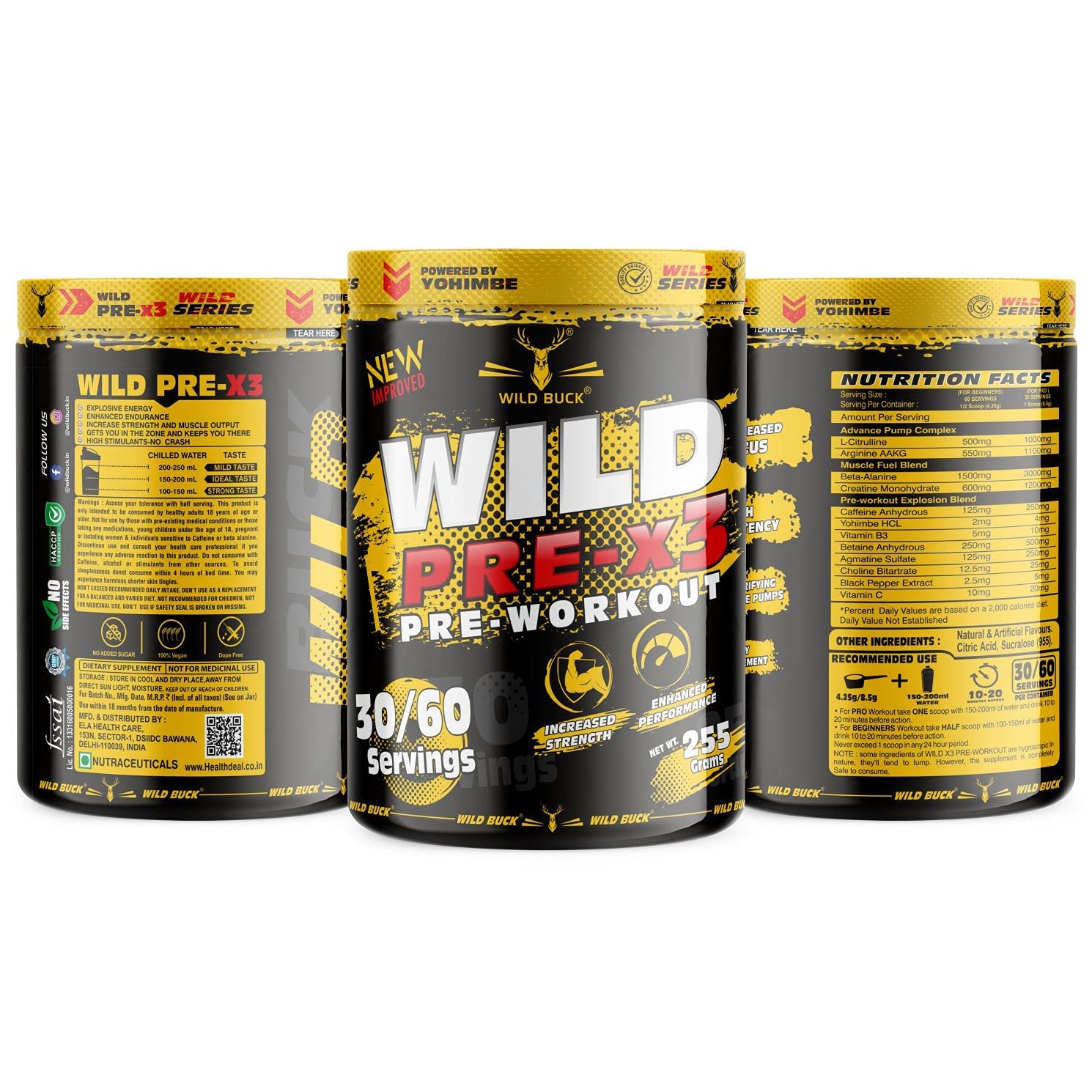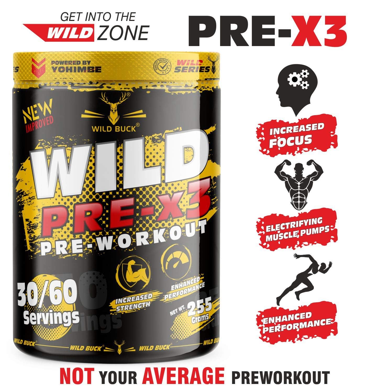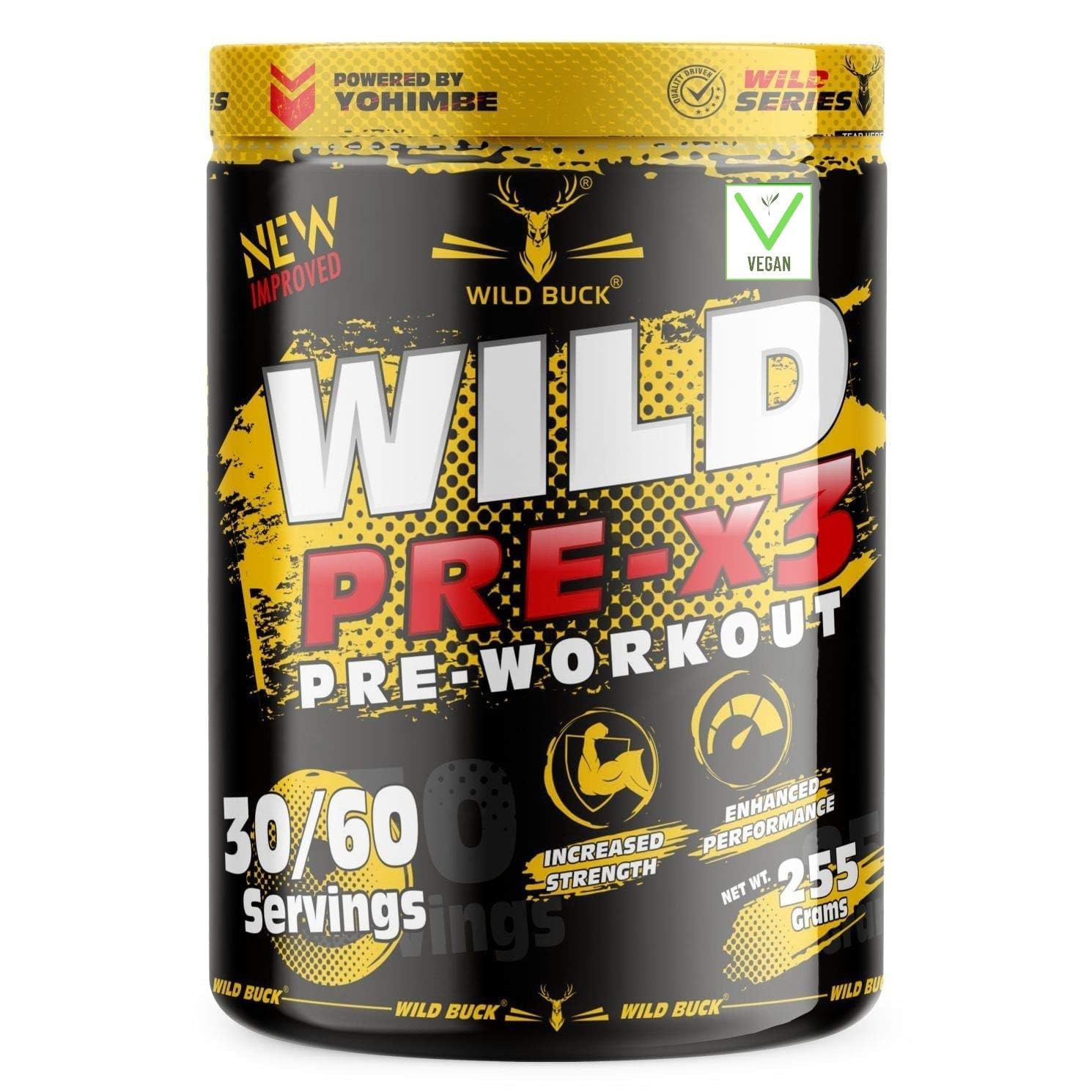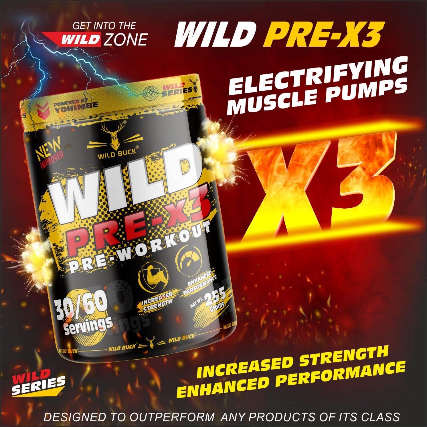 The WILD BUCK Pre-workout : Designed to elevate your energy focus power output and performance levels it will help you power through every training session and prime you for harder heavier and more productive lifts. With so many ingredients dedicated to powering up your results The WILD BUCK Pre-workout is in a league of its own. Stop leaving gains on the table. Start making the most of your workouts today with The WILD BUCK Pre-workout the lifting partner youâve been looking for. Serving: For Insane Workout - Take One Scoop with 150-200ml of water and drink 10-20 minutes before action. For Hardcore Workout - Take half Scoop with 150-200ml of water and drink 10-20 minutes before action.