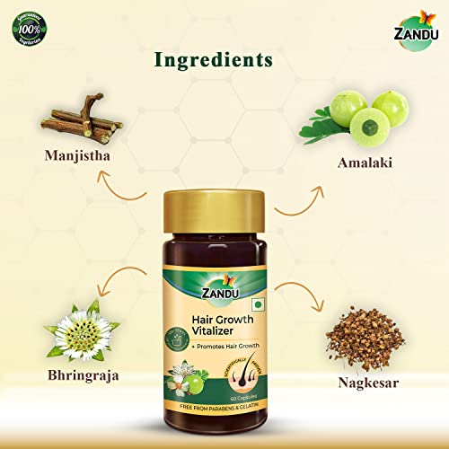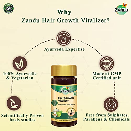 Hair care forms an essential part of our daily self-care routine. We must take care of our hair because it has the power to define our whole personality and can become our beauty regimen partner that can help us to boost our confidence levels. In addition to this our modern life with rapidly changing dietary & lifestyle factors like rising stress anxiety & pollution levels poor dietary habits leading to iron deficiency or anaemia are bound to affect our hair quality & can trigger hair fall. And thus we are on the constant lookout for a safe natural and reliable solution to nourish & improve our overall hair quality We at Zandu understand your hair care concerns and thus present Zandu Hair Growth Vitalizera herbal formulation made using natural herbs that are useful for hair and scalp protection. This hair growth vitalizer can work as a Sanjeevani for your hair strands as Ayurvedic herbs used in this product are Bhringaraja Amlaki Manjishtha Nagkesara Ashwagandha Brahmi Abhrak Bhasma Godanti bhasma and many others to help with controlling hair fall & promote hair growth. They are safe and can help you to grow your hair roots stronger. Our hair growth vitalizer is specially formulated to offer plenty of hair related benefits such as helping with hair fall maintaining healthy hair providing nourishment to hair and scalp helping protect the scalp from skin infection. This natural formulation is vegetarian and is free from chemicals gelatin parabens and sulphates. If you are looking for a hair care companion then this Hair Growth Vitalizer is just for you! Now dont just wait for special occasions to start taking steps towards your haircare. This Zandu Hair Growth Vitalizer is fortified with rich and potent ingredients and herbs that can easily fit into your busy routine to cater to your hair related problems. Add a touch of care to your hair with our Hair Growth Vitalizer and be ready always anywhere !