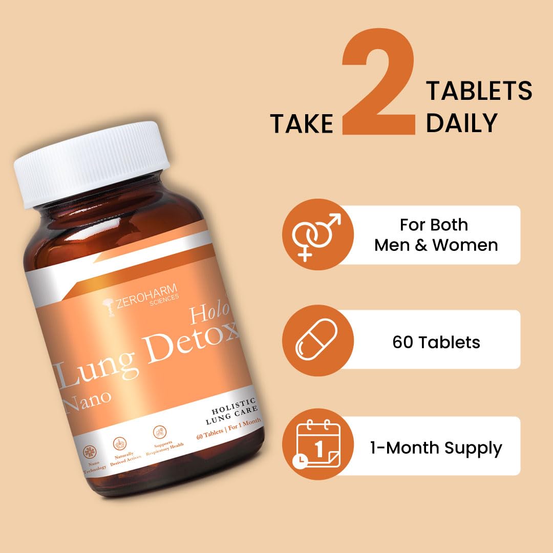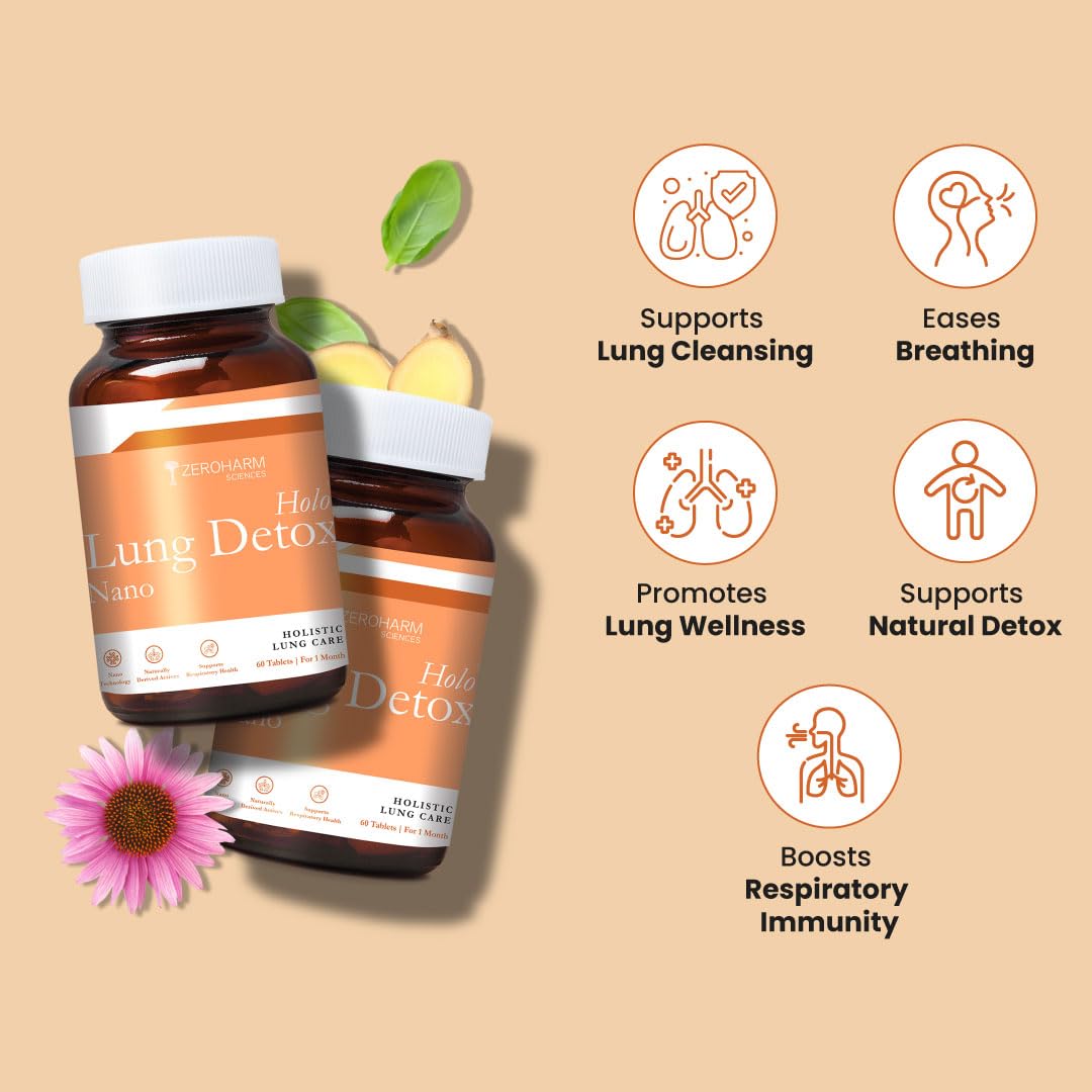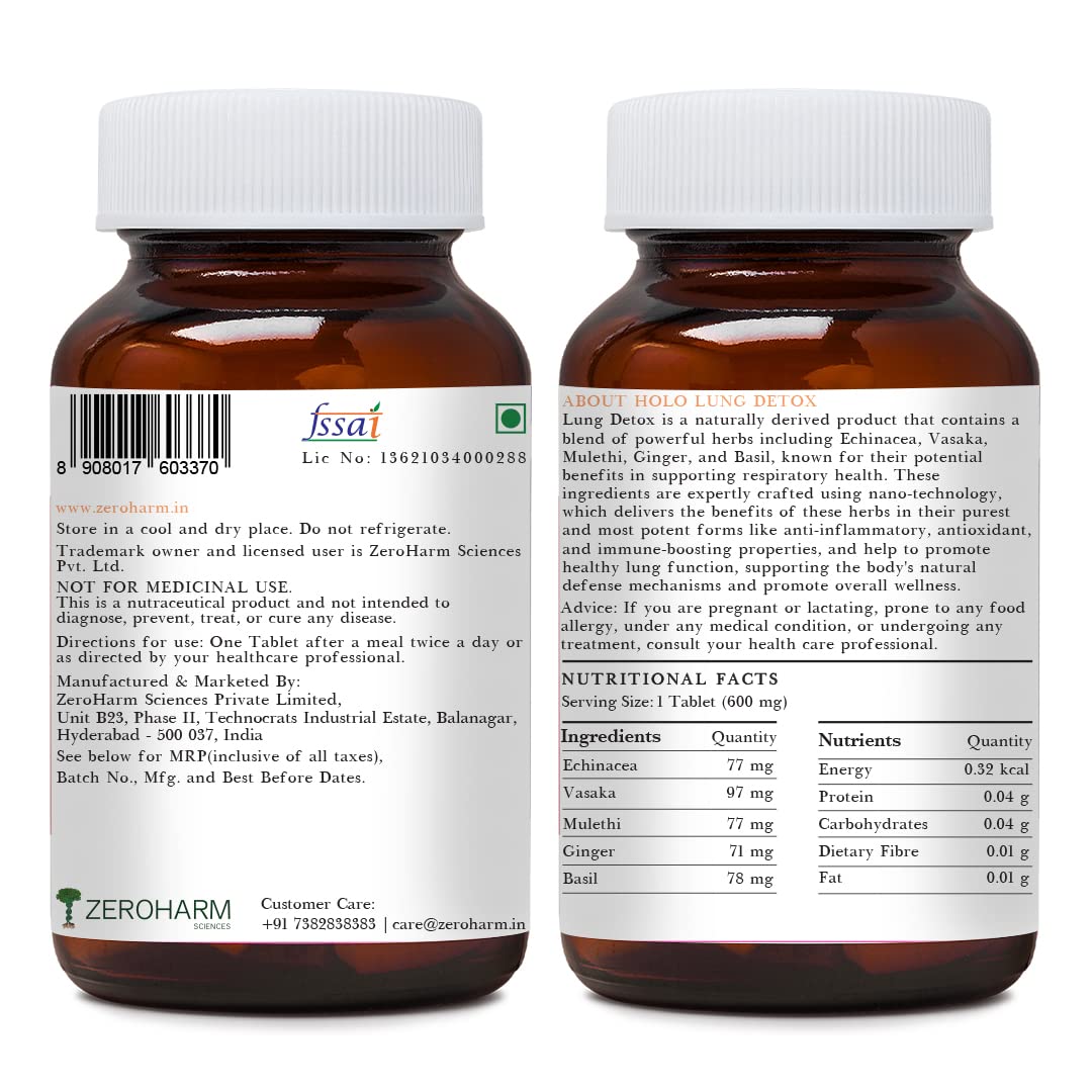 ZEROHARM Holo Lung Detox Tablets - Ayurvedic Lung Cleanse for Pollution Smoking & Respiratory Health - With Vasaka Echinacea Ginger Basil Mulethi - Nano Technology for Men & Women - 60 Tablets