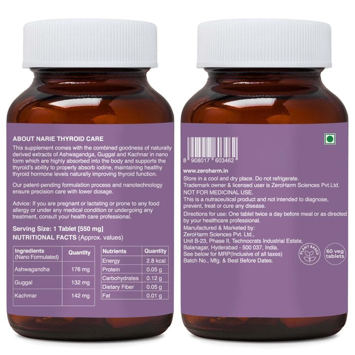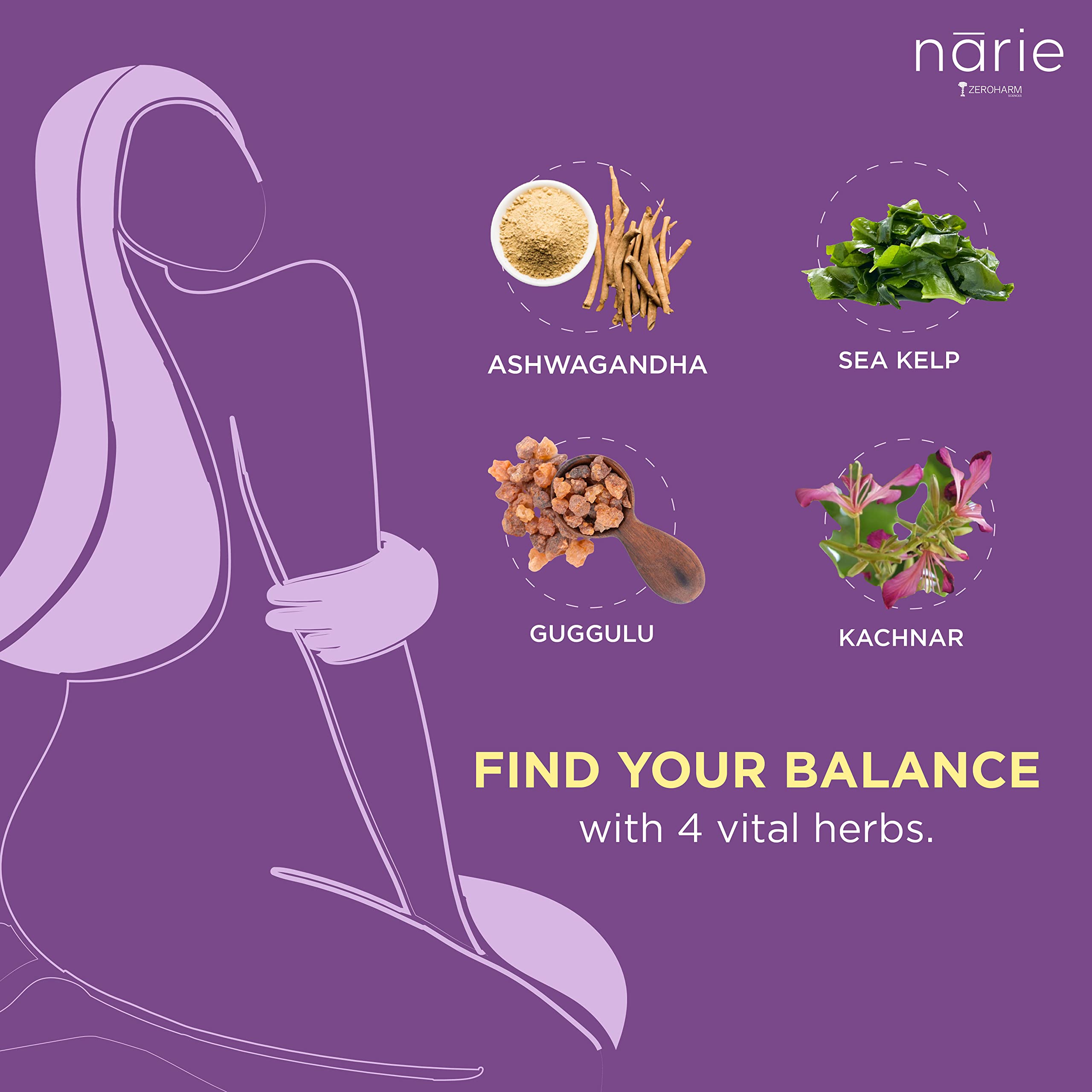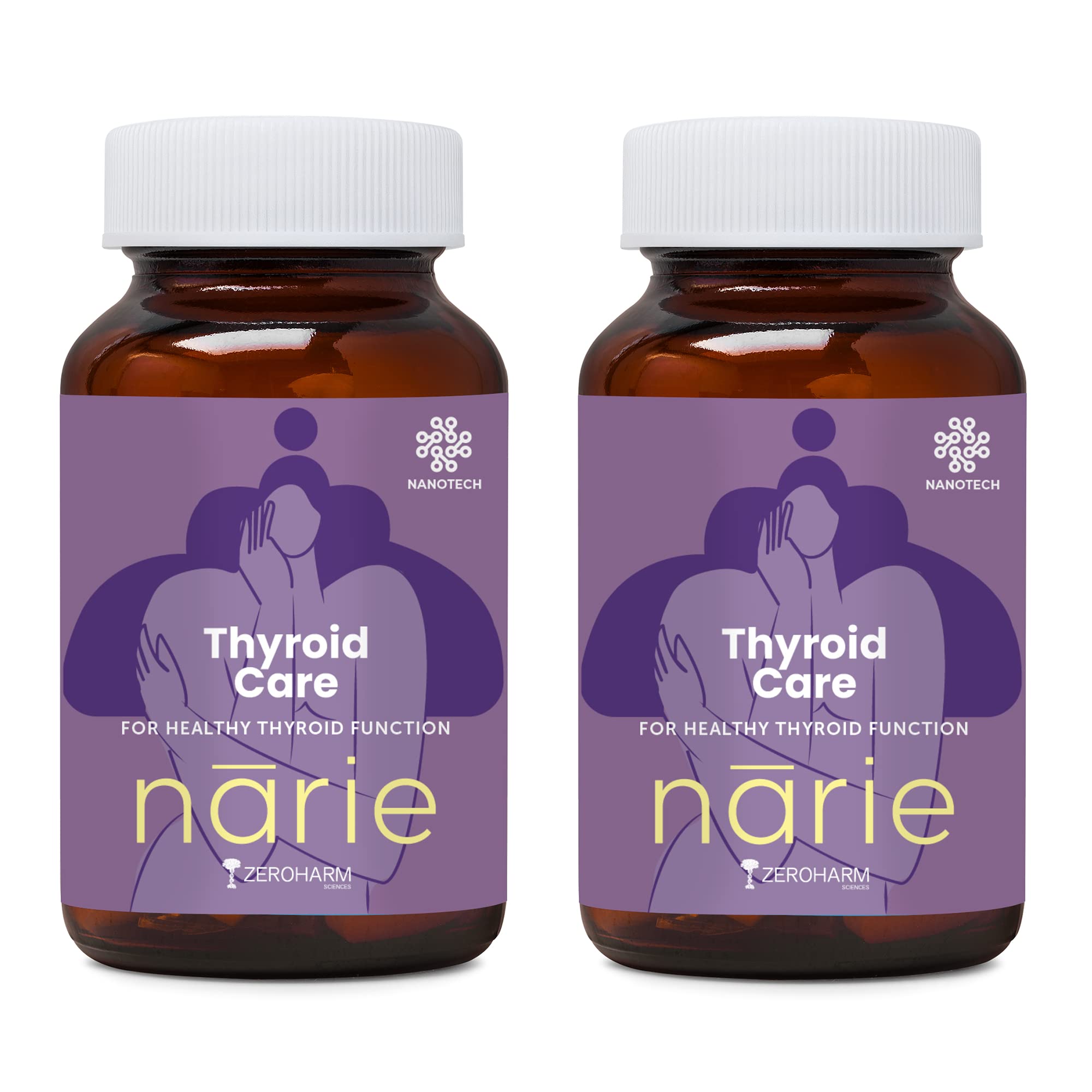 Narie Thyroid Care by ZeroHarm optimizes thyroid function for improved cycles moods metabolism and better weight stress and sleep management. With natural ingredients like Ashwagandha Sea Kelp Guggulu and Kanchnar it helps with better energy and stamina