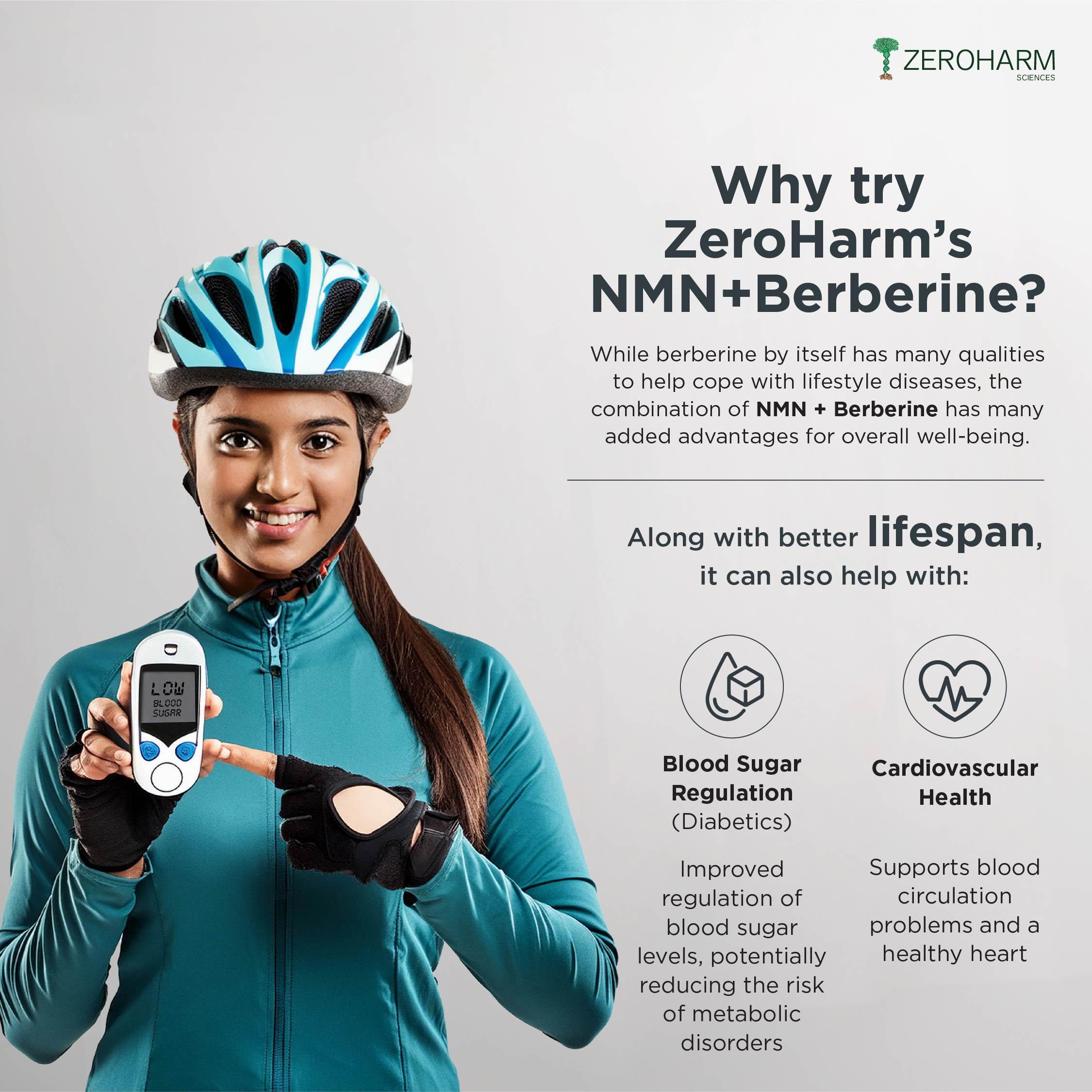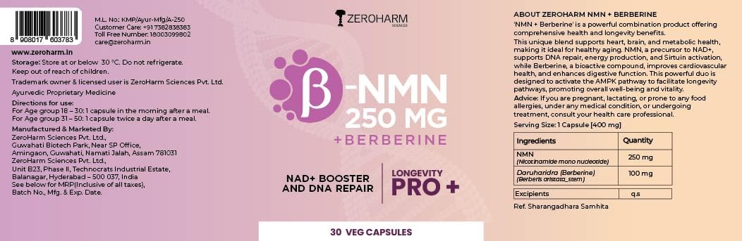 ZEROHARM NMN 250 MG + Berberine Capsules | Longevity Supplement | 99.5% Pure NMN | Boosts Energy Focus & Cellular Health | Healthy Ageing | NAD+ Booster | 30 Capsules | For Men & Women