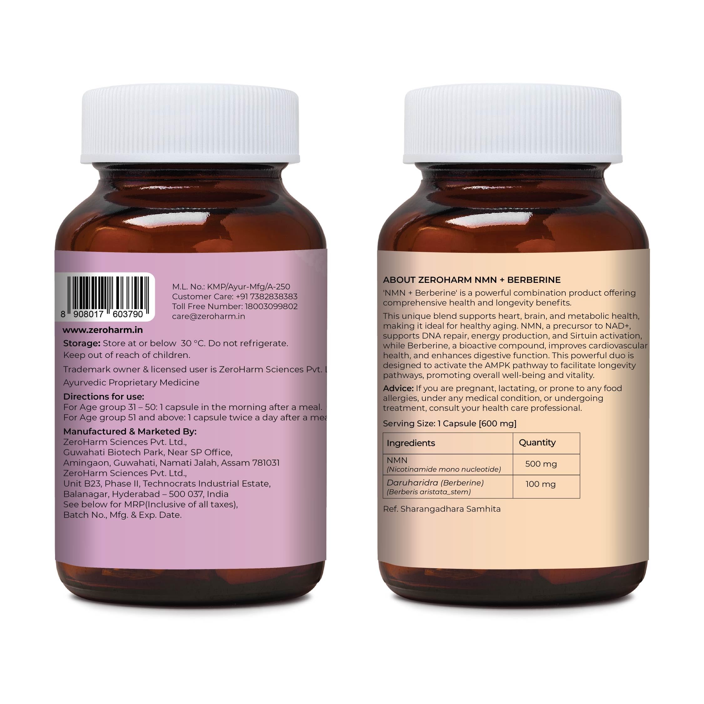 ZEROHARM NMN 500 MG + Berberine Capsules | Longevity Supplement | 99.5% Pure NMN | Boosts Energy Focus & Cellular Health | NAD+ Booster | 30 Veg Capsules | For Men & Women