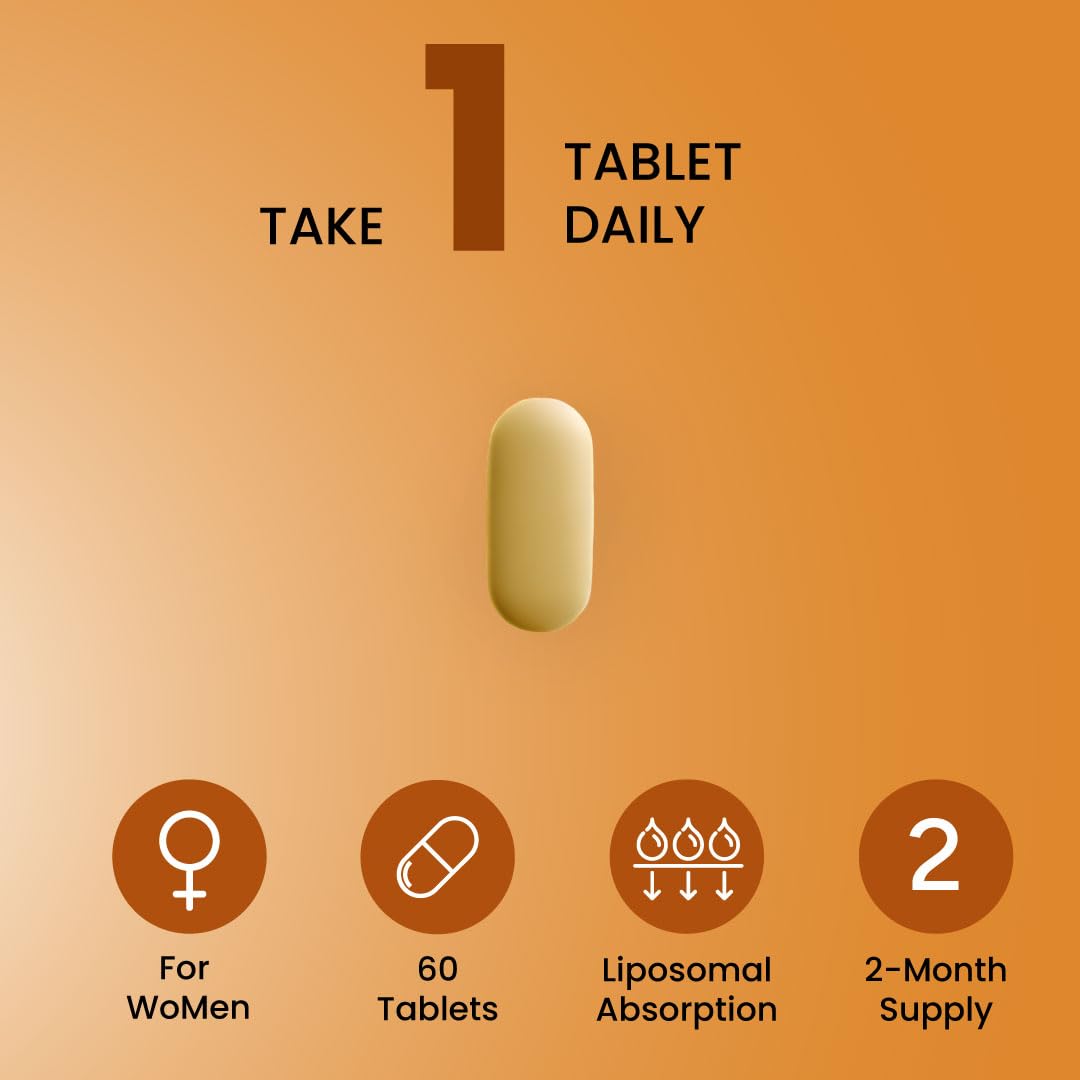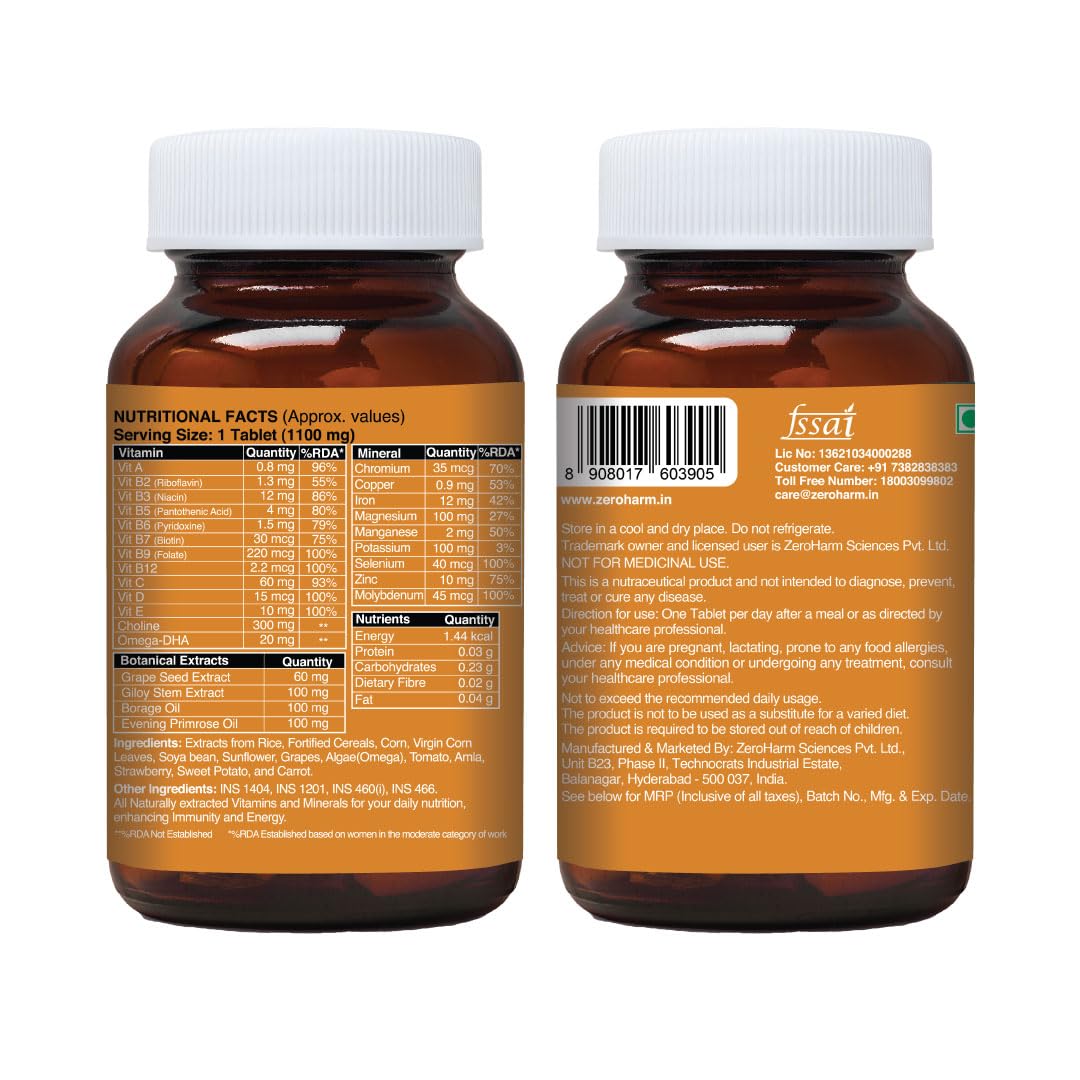 ZEROHARM Whole Food Multivitamin for Women - With Omega DHA Essential Vitamins & Minerals - Vitamin C B D A Biotin Iron Zinc Selenium - Energy Immunity & Hair Skin Health - 60 Veg Tablets
