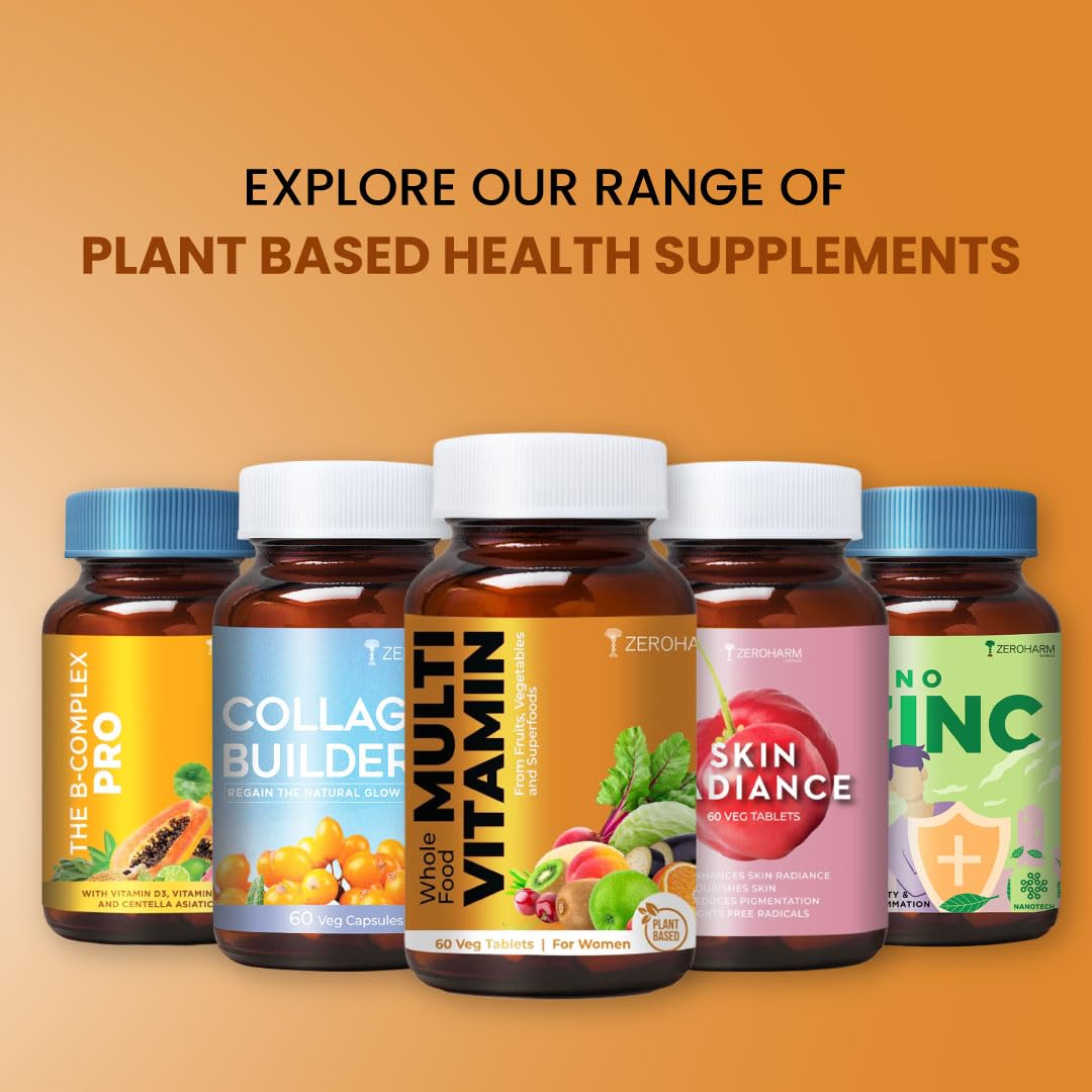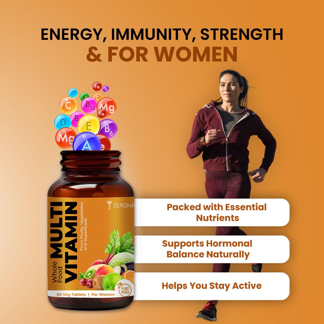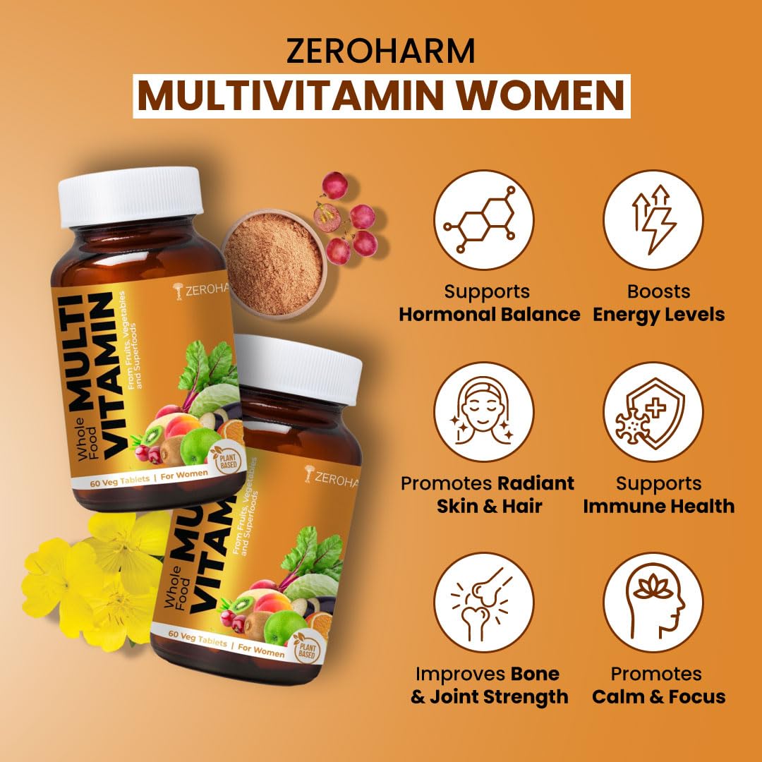 HomeHealth & PersonalDiet & NutritionHealth SupplementsZEROHARM Whole Food Multivitamin for Women - With Omega DHA Essential Vitamins & Minerals - Vitamin C B D A Biotin Iron Zinc Selenium - Energy Immunity & Hair Skin Health - 60 Veg Tablets
