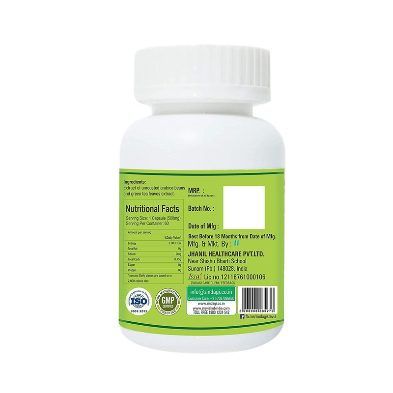 Green tea & green coffee extract capsules are a natural analog for caffeine and rich in antioxidants, improves immunity good for skin care. Presence of decaffeinated & unroasted arabica coffee beans extract which contains chlorogenic acid believed to be responsible for the weight loss. This effective dietary supplement is perfect to lose weight. It also helps you to manage blood glucose levels, lowers blood pressure and prevent from excess fat level in the body. It is made especially with a view to serve a quality life to diabetics, obese and fitness conscious people. A perfect way to maintain health and quality of life. Ingredients: Unroasted decaffeinated green coffee beans extract and tea leaf extract