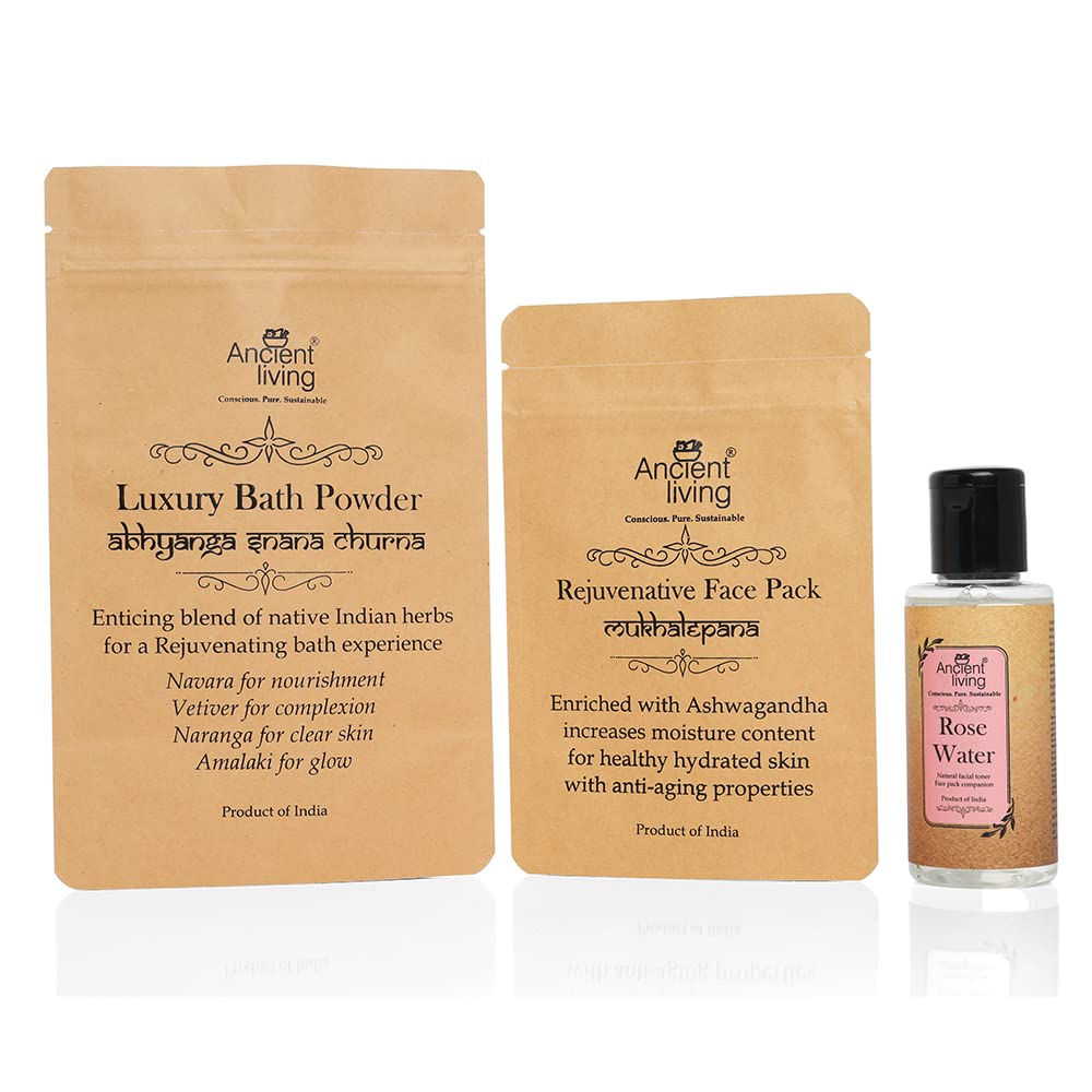 The Ancient Living Anti Ageing Combo Pack comprises of Ancient Living Rejuvenative Face Pack Ancient Living Luxury Bath Powder Ancient Living Rose Water Ancient Living Rejuvenative Face Pack Ancient living Rejuvenate face pack is enriched with Yashtimadhu increases moisture content with anti-aging properties for healthy hydrated skin. Ancient Living Luxury Bath Powder Ancient Living Luxury Bath Powder enticing blend of native Indian herbs for a Rejuvenating bath experience. Navara for nourishment Vetiver for complexion Naranga for clear skin Amalaki for glow. Ancient Living Rose Water Ancient Living Rose water is collected as a residue during the essential oil extraction of fresh roses. It is a natural hydrating facial toner with the cooling soothing & moisturizing properties of rose. Use it along with Ancient Living Face pack powder for a Rejuvenating experience.