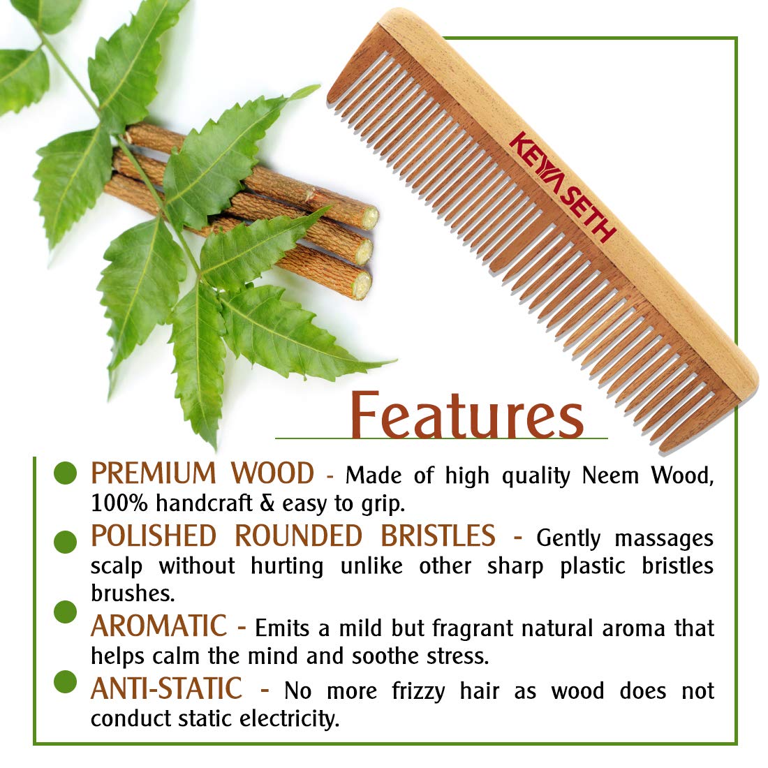 Promotes Hair Growth: The Wooden Neem Comb helps in Fresh Hair Gain by Stimulating Blood Circulation; Gently Detangles Hair; Being Anti-Static it prevents hair frizz; suits All Hair Types
