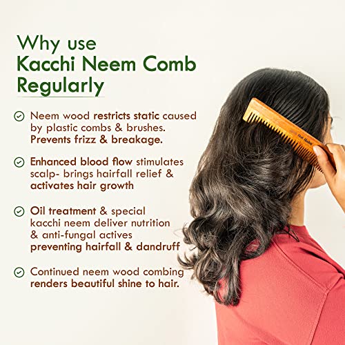 HANDMADE 100% NATURAL Dual Tooth KACCHI NEEM COMB For Multi-Action - DETANGLING FRIZZ CONTROl & SHINE. Suited for all hair types. Benefits Young neem wood combs provide multi-faceted benefits for hair & overall health Drives hair growth & thickness Controls hair loss & thinning Keeps away brittleness cuticle damage & hair breakage. Kitchen made hairmask for absolute hair fall control & complete hair nutrition. Enriched with Slow Heat Infusion of fresh hibiscus flowers hibiscus leaves neem curry leaves amla bhringraj fenugreek in multiple oils like sesame mustard coconut castor jojoba argan and more. 19 Powerful Ingredients packed into one.