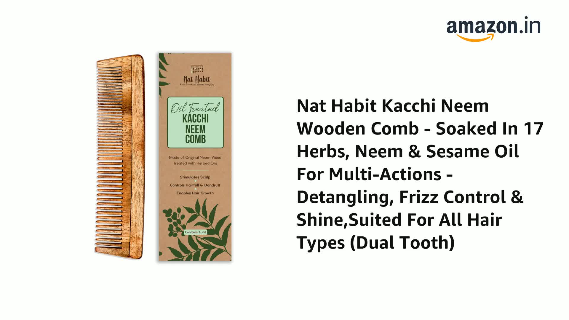 Nat Habit Kacchi Neem Wooden Comb, Soaked In 13 Herbs Neem & Sesame Oil For Multi-Actions - Detangling, Frizz Control & Shine,Suited For All Hair Types (Dual Tooth)